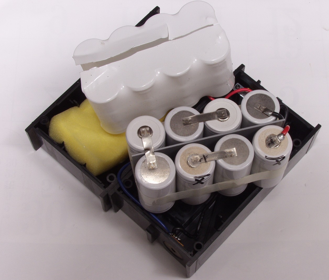 | A. Ni−Cd Battery Pack PP−ZN/P3 修理。 画像をクリックすると、大きく(横幅2050ドット)表示されます。 A1. 知人のカメラ屋より入手、古いNi−Cd電池をNi−MHに交換して、容量UPする。 古いNi−Cd PACKを開ける 2本が液漏れしている。 |