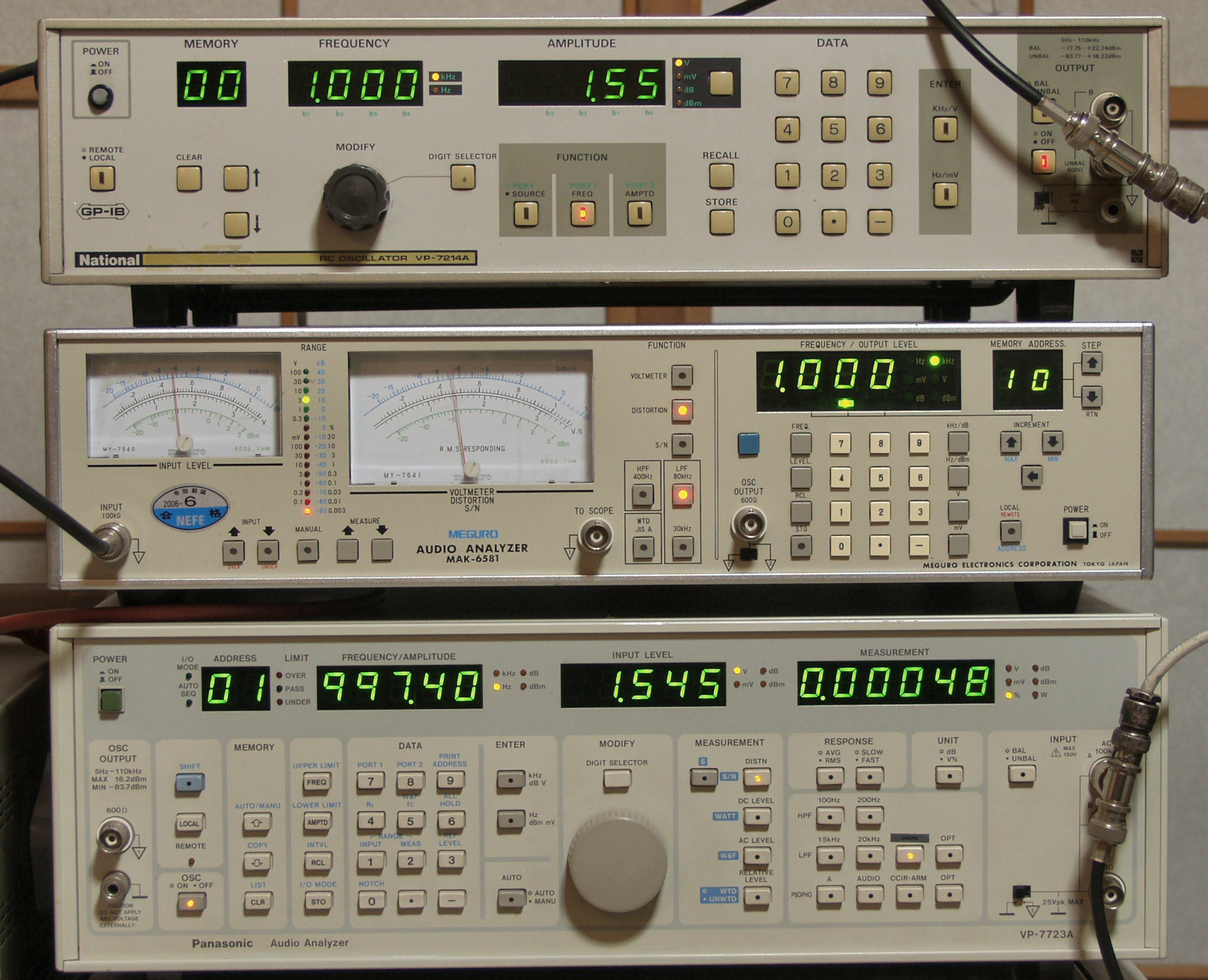 | E3. 頑張って調整する。上=MEGURO MAK−6581、 中=VP−7721A、下2台=VP−7214A。 上=MAK−6581での歪み率測定=0.0012%(0.003%レンジ、80HzBW sw入)。 取扱説明書仕様=20Hz〜10kHz、(80HzBW sw入)で残留歪み率=0.0018%以下。 中=VP−7721Aでの歪み率測定=0.001%(0.003%レンジ、80HzBW sw入)。 取扱説明書仕様=10Hz〜15.99kHz、で残留歪み率=0.0018%以下。 下=VP−7214AよりOSC出力=1kHz、10V出力。 取扱説明書仕様=不平衡出力50Hz〜10kHz、で残留歪み率=0.0001%以下。 現手持ち測定機器では測定不可 |