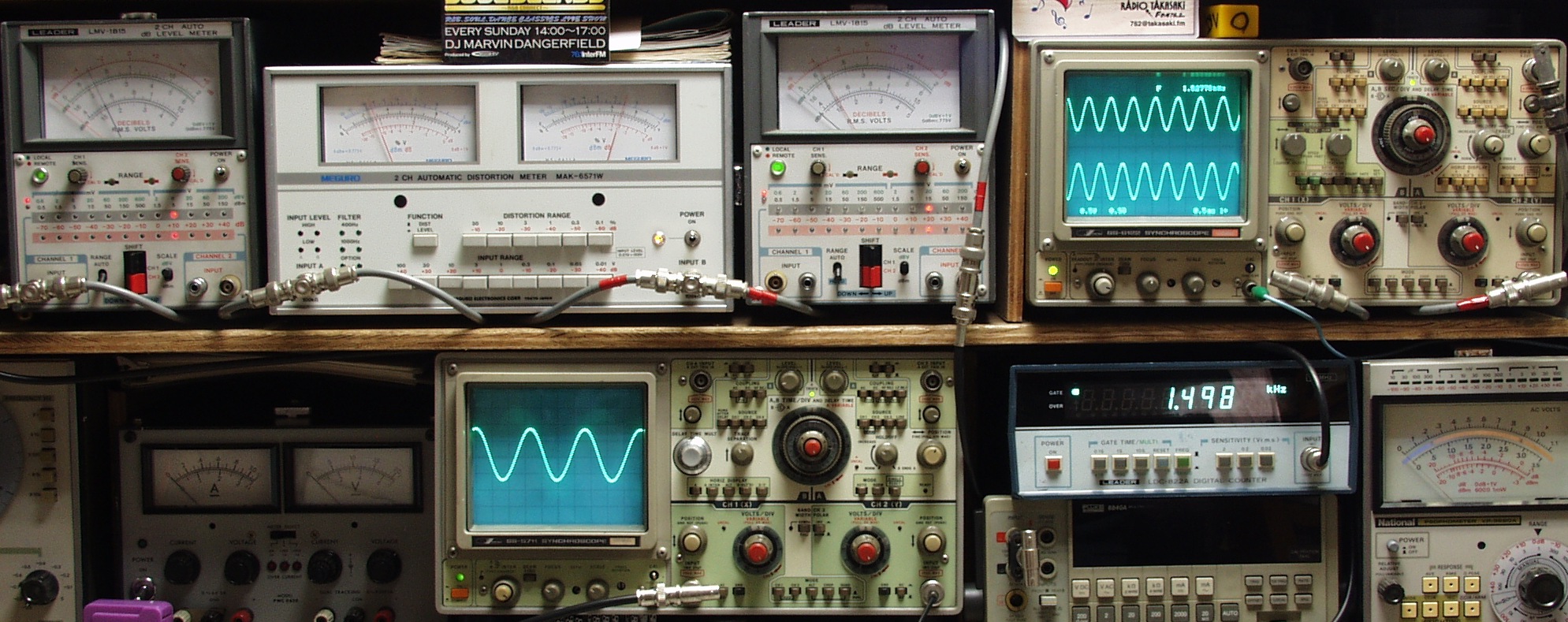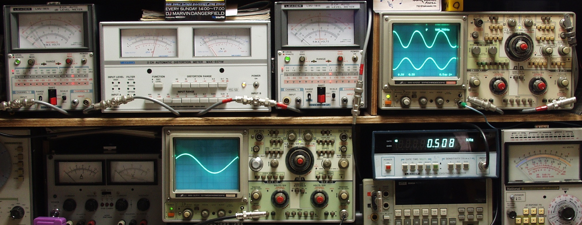 | E. 測定・調整。 画像をクリックすると、大きく(横幅2050ドット)表示されます。 E1. 調整・測定 左上のパワーオーディオ発振器からネットワークに入力、LF出力=L出力、HF出力=R出力とする。 |
