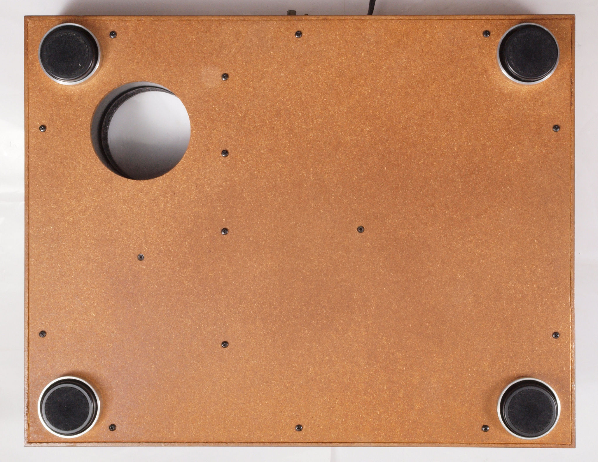 | A16. 点検中 上から見る。ユーザはタンテーブル(プラッター)が外せないので「かいものを」入れて固定。 このタンテーブル(プラッター)がアルミ製で軽いので、軸への負担は少ない。 |