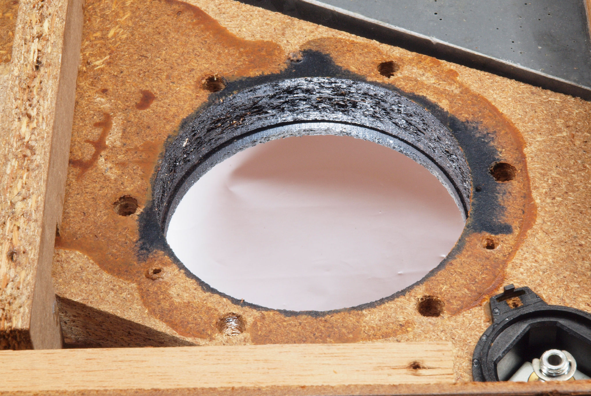 | W35. 修理中 プラッター軸受取付穴、反対側。 圧縮材にボンドを染みこませる、ネジ穴も塗る。 | ||||||||||||||||||||||||||||||
