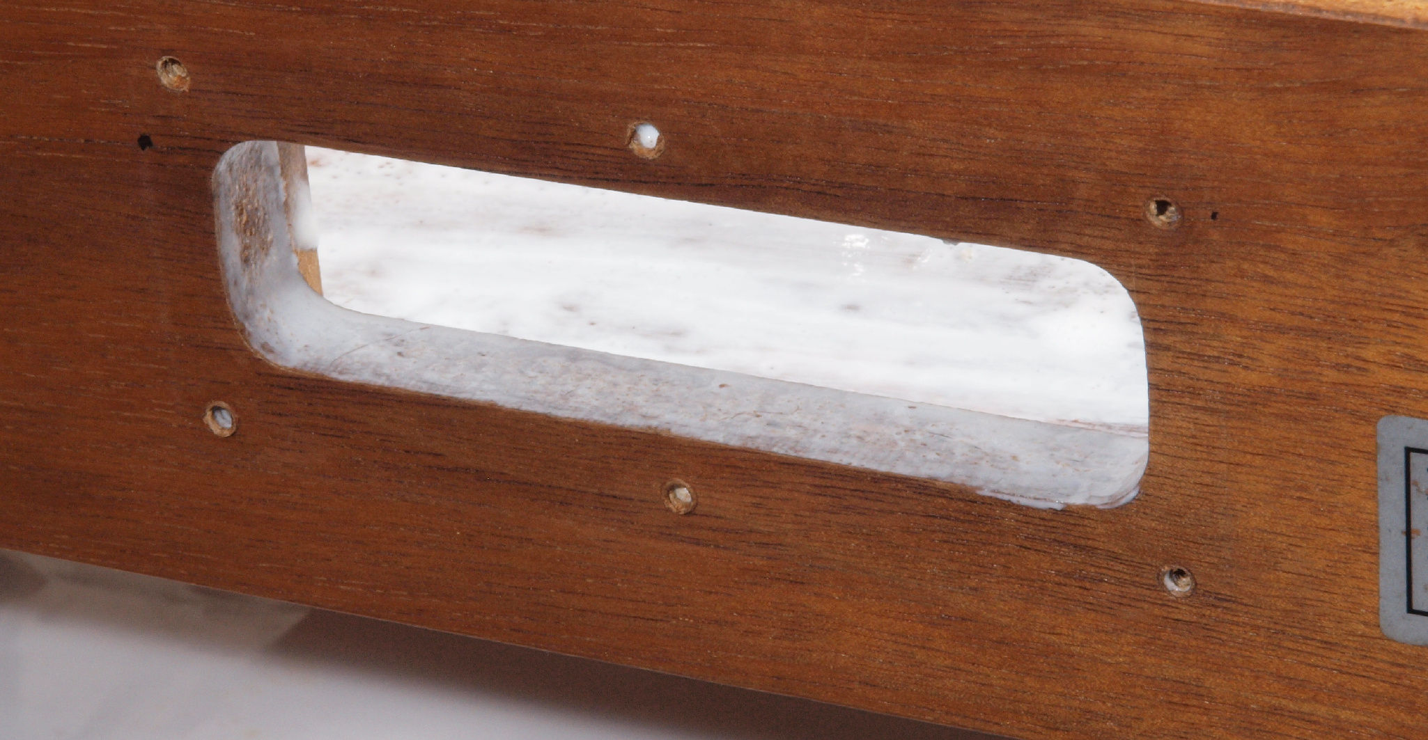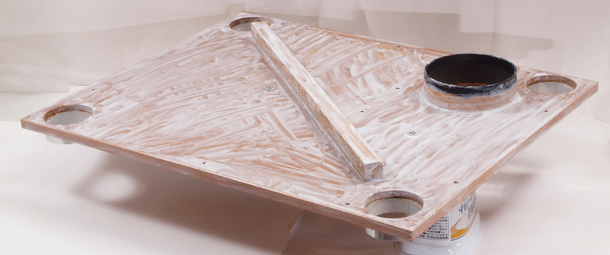 | W26. 修理後 アーム取付穴。 乾燥後さらにウレタン塗料を塗る。 | ||||||||||||||||||||||||||||||