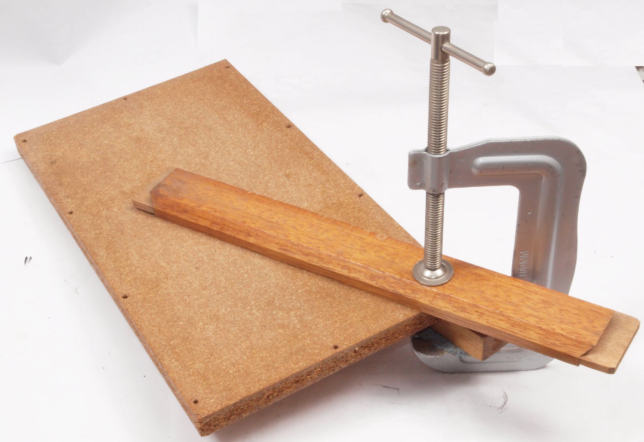 | C84. 修理中 ボンドが乾燥した所で、浮いた所を万力で引き締める。 |