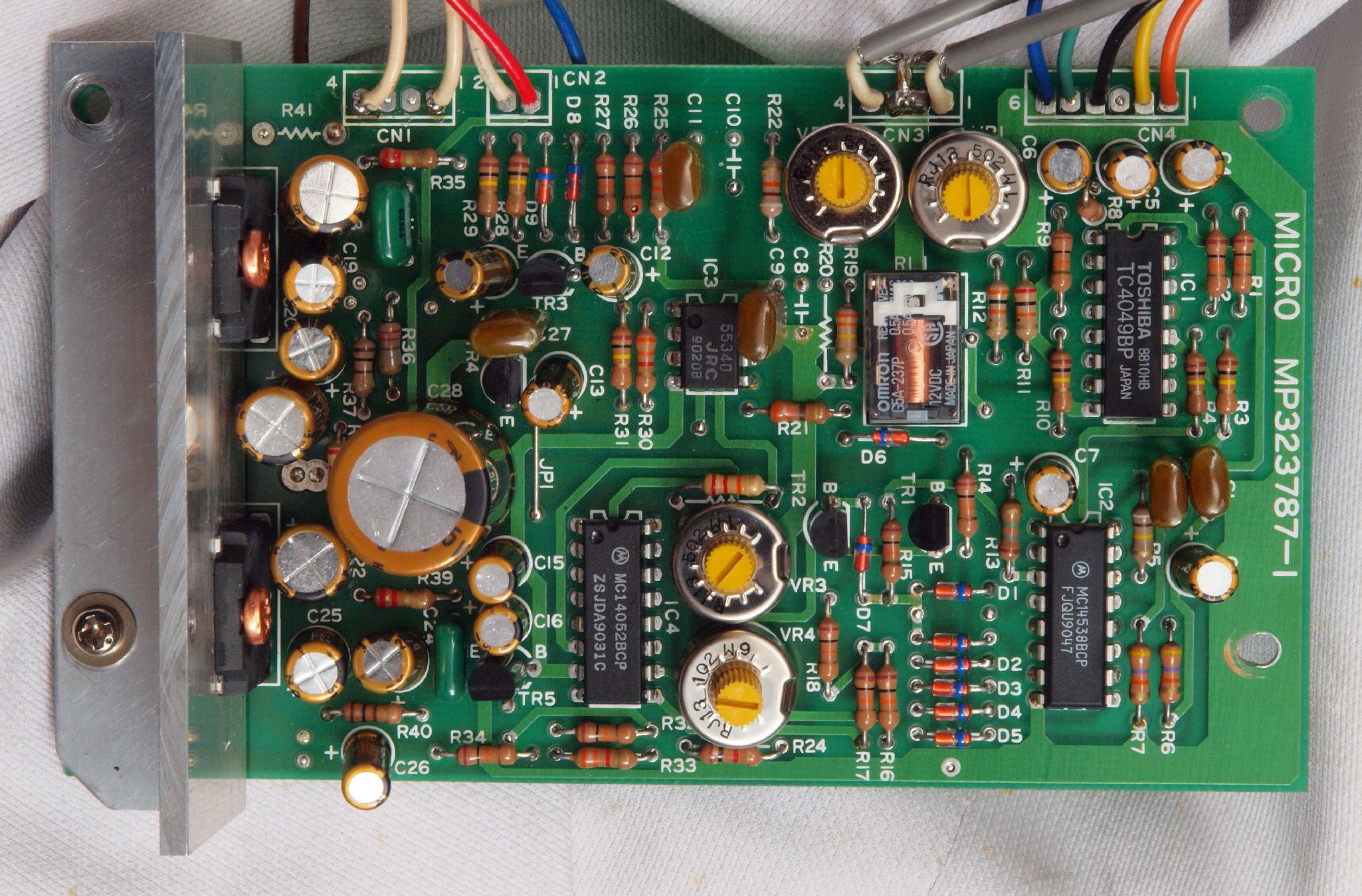 | C22. 修理後 モーターコントロール基板、 半固定VR4個、電解コンデンサー18個、モーター駆動AMP−IC.2個交換 |