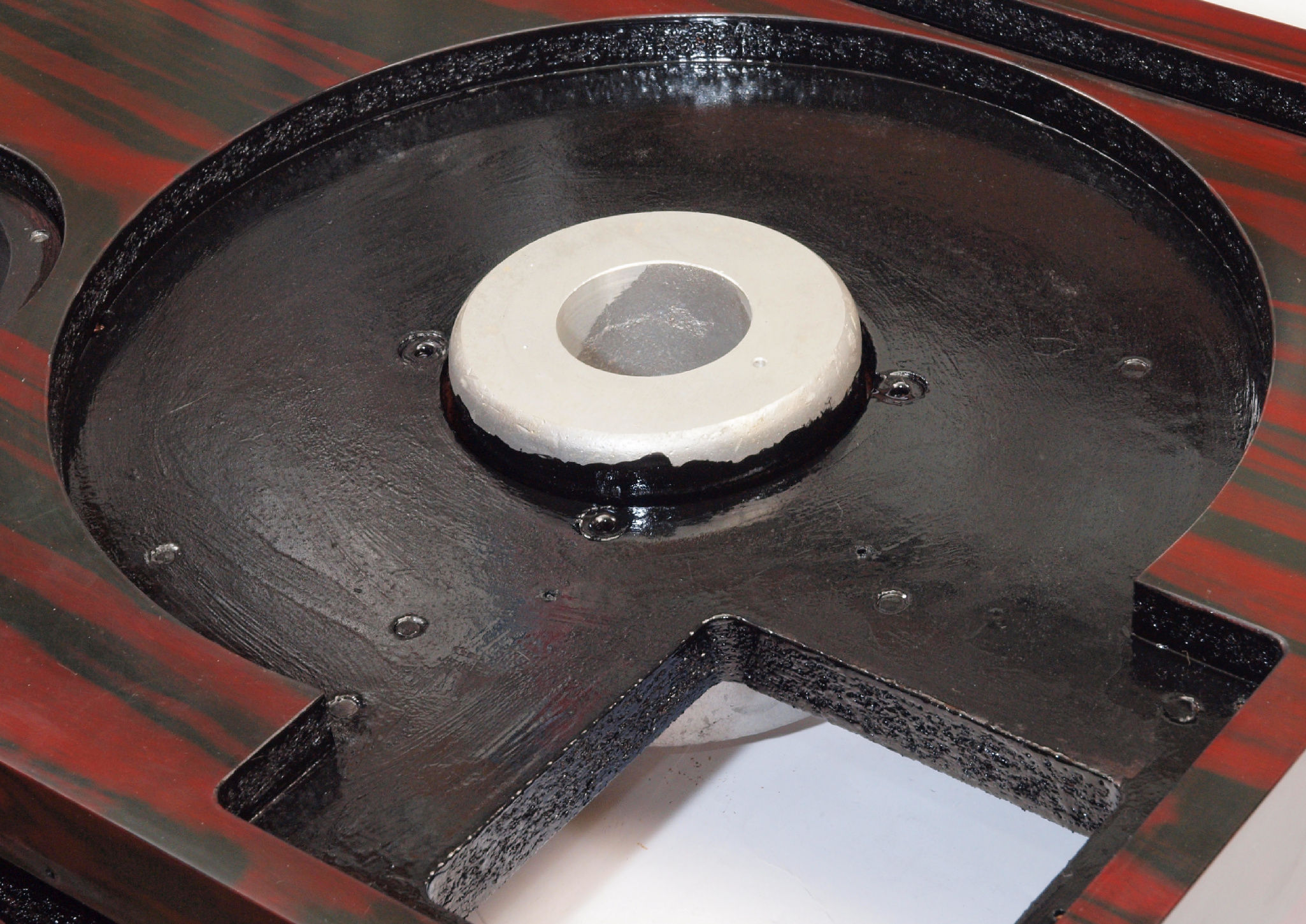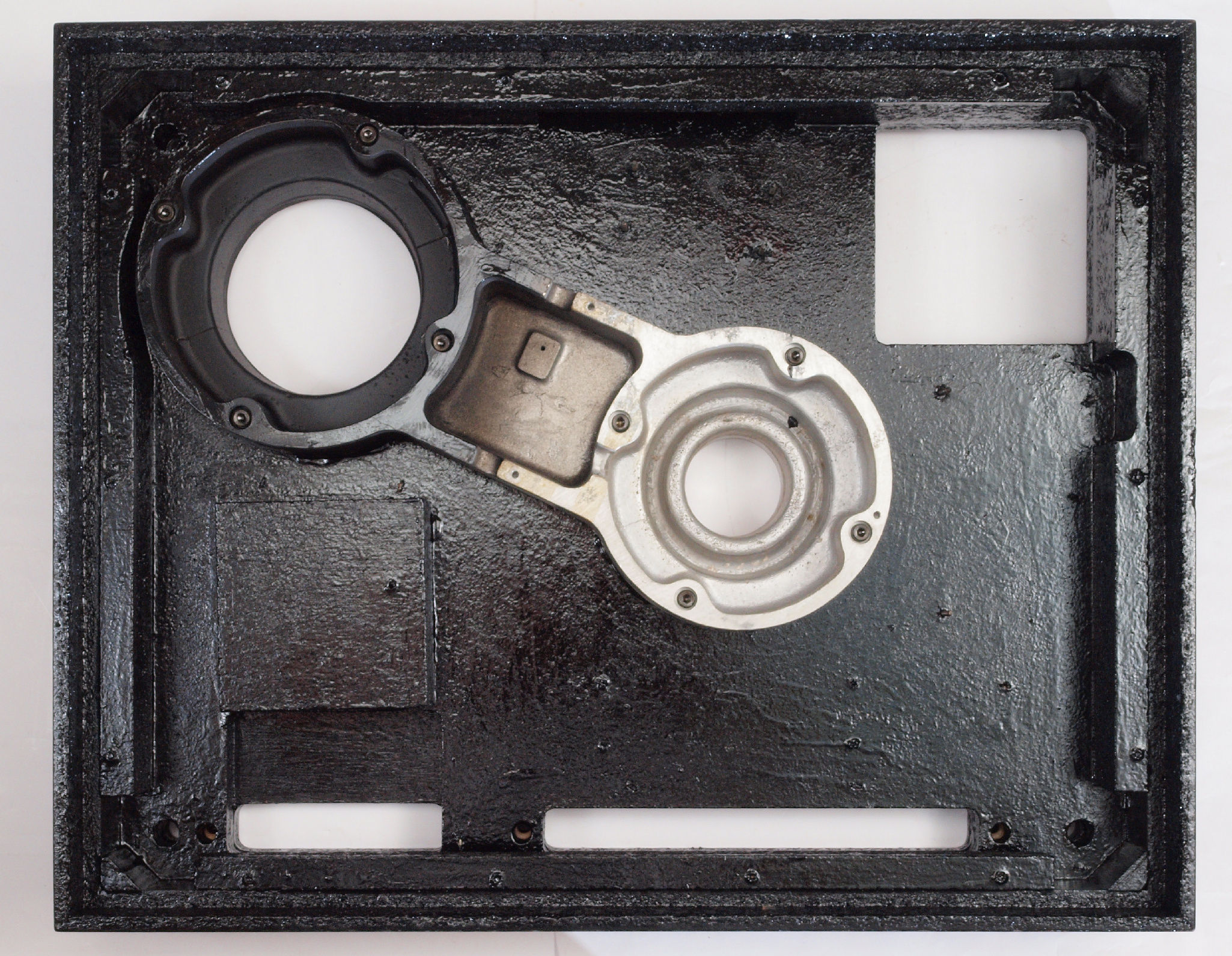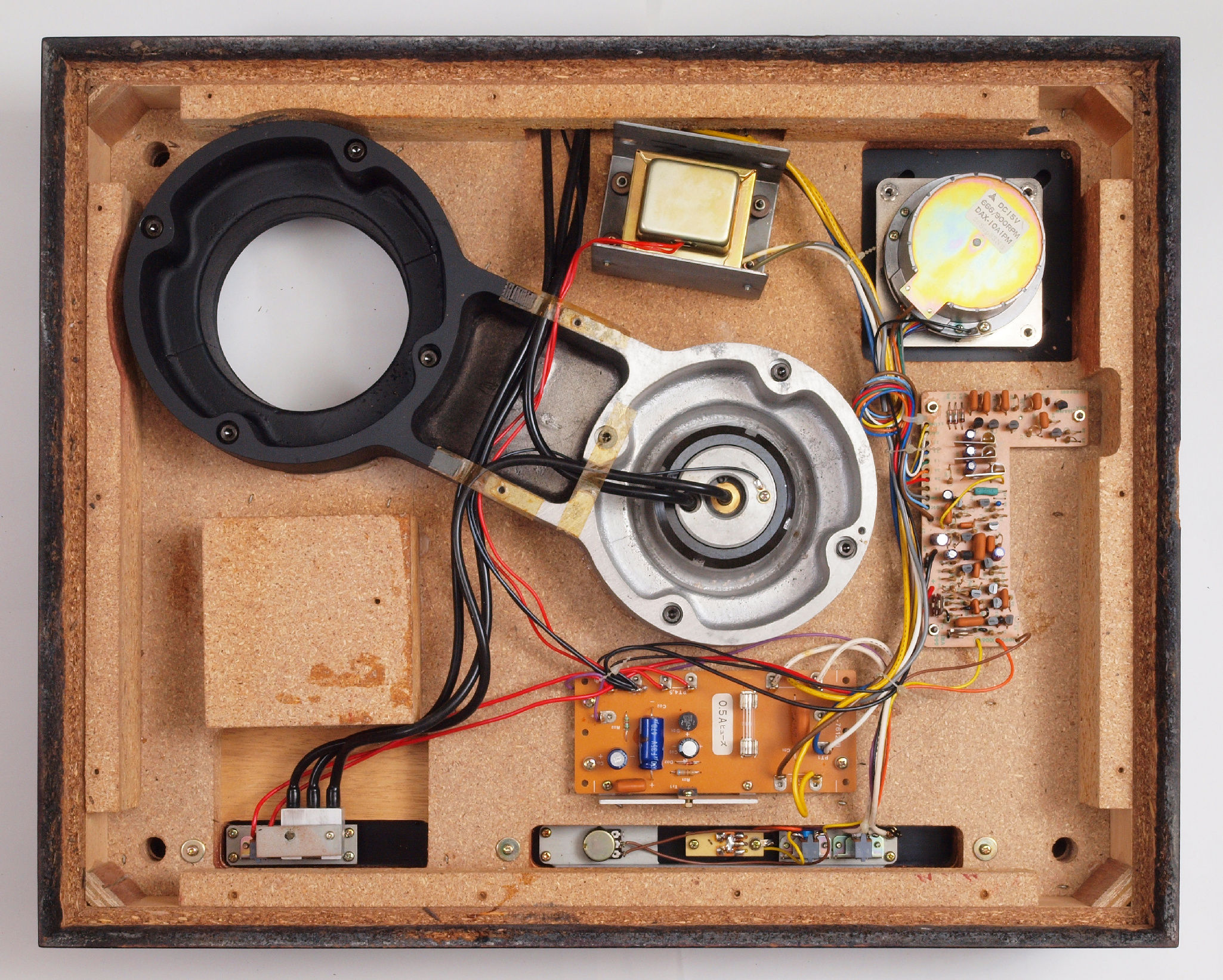 | W. 下蓋及び本体木部 修理状況。 W01. 修理前 タンテーブル軸ユニットを外した本体。アーム取付一体シャーシは接着して有るのでそのまま。 |