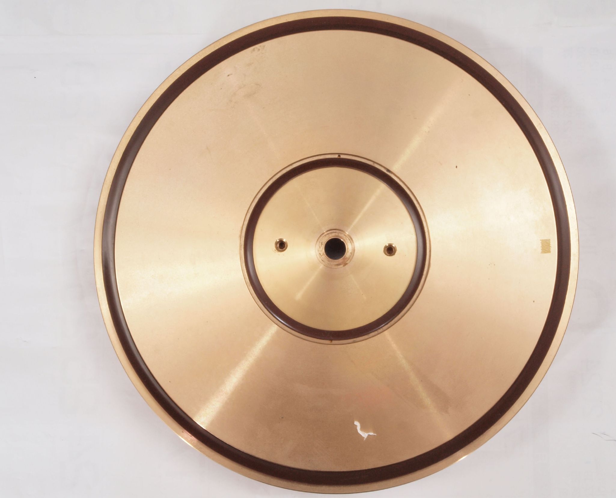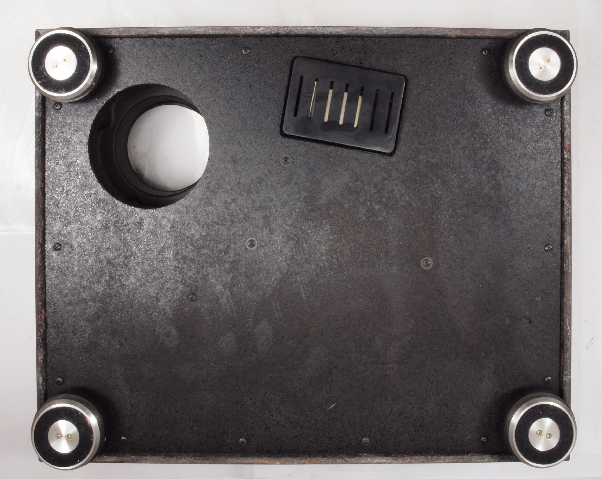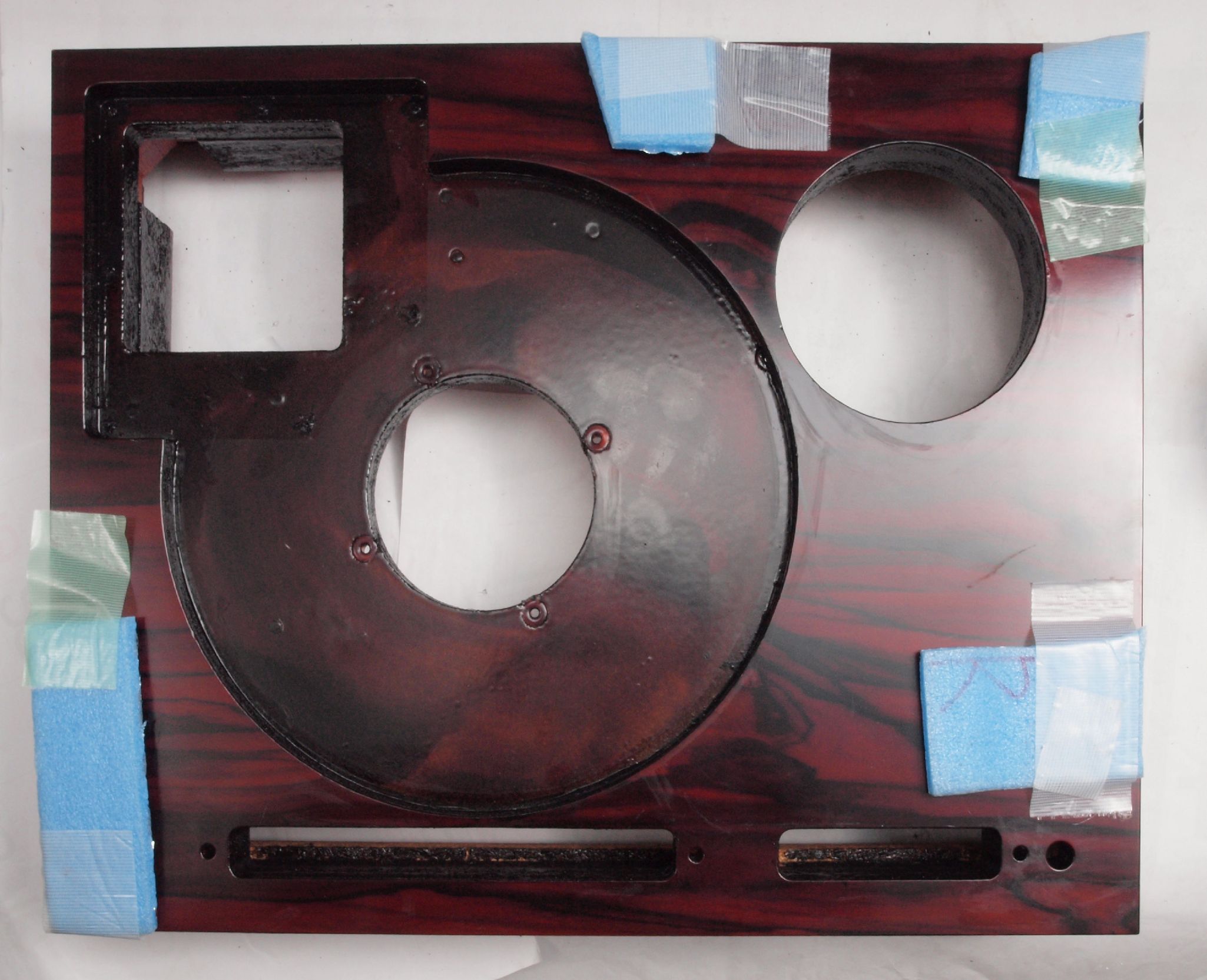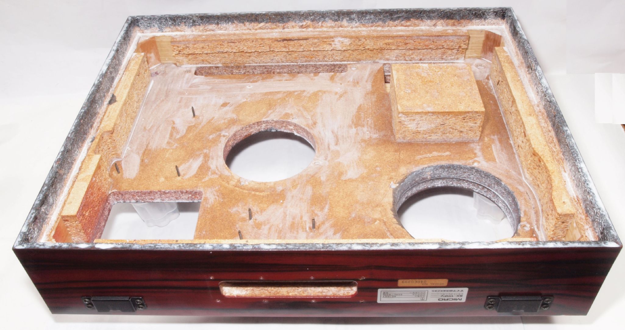| W. 下蓋及び本体木部 修理状況。 画像をクリックすると、大きく(横幅2050ドット)表示されます。 W1. 修理前 タンテーブル軸ユニット、アーム取付一体シャーシを外した本体。 |