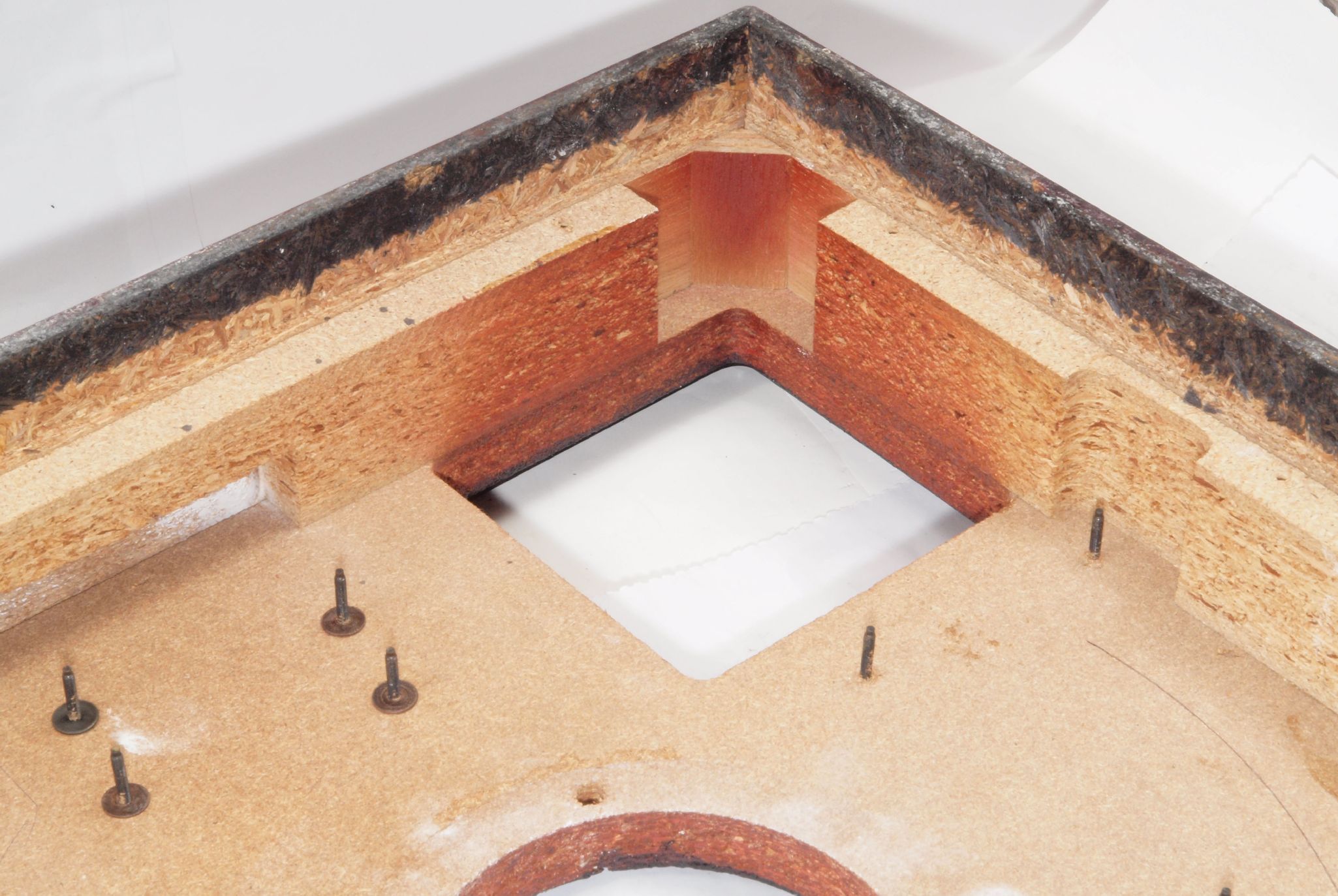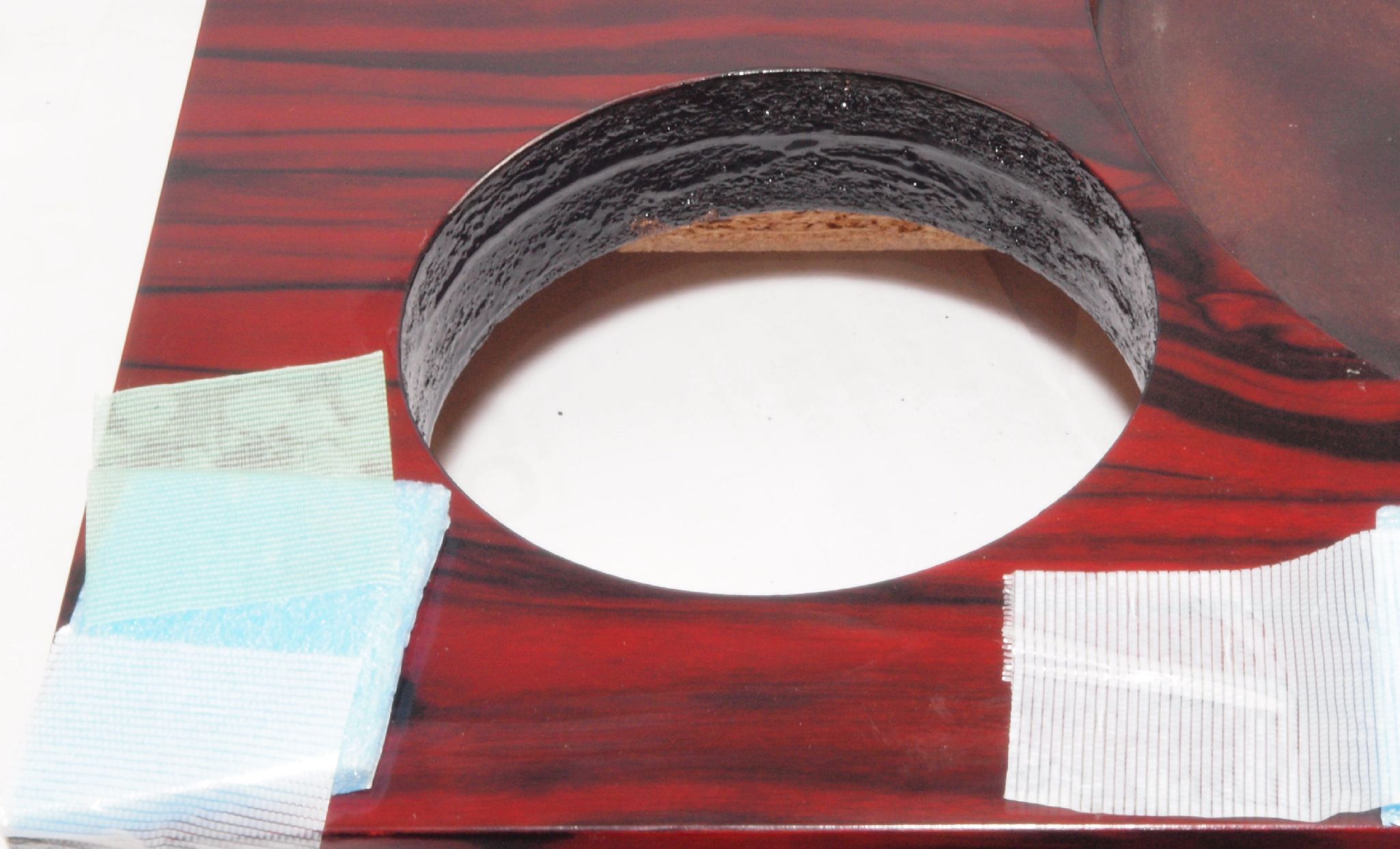 | W1B. 修理中 タンテーブル取り付け穴。 水性木工ボンドを塗布する。 | ||||||||||||||||||||
