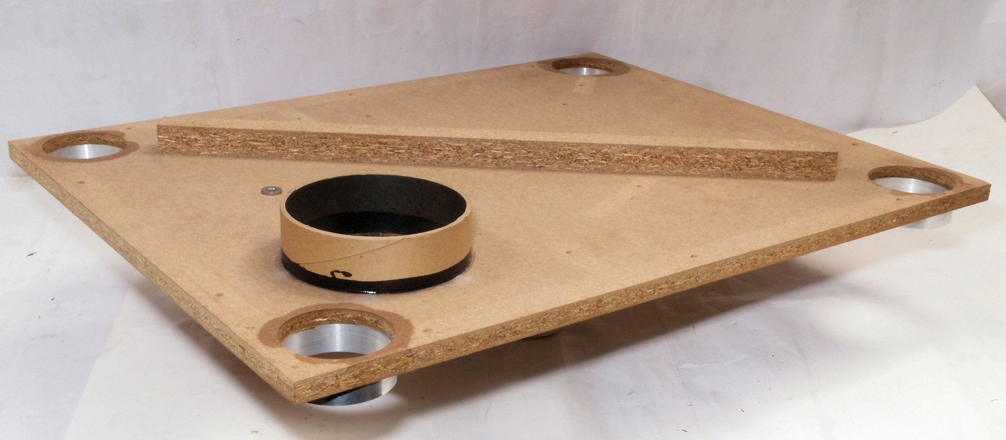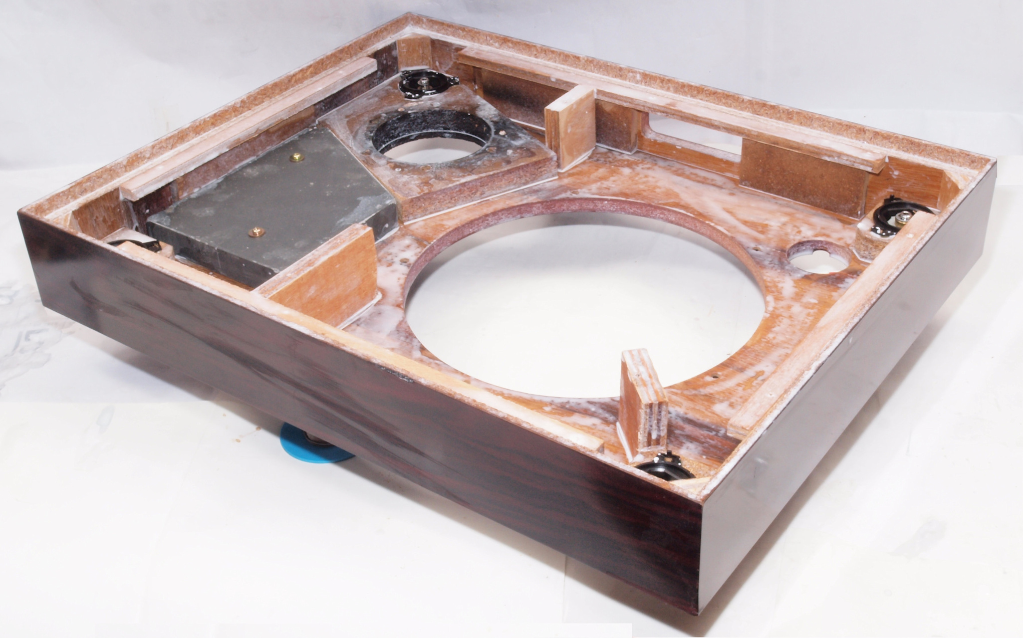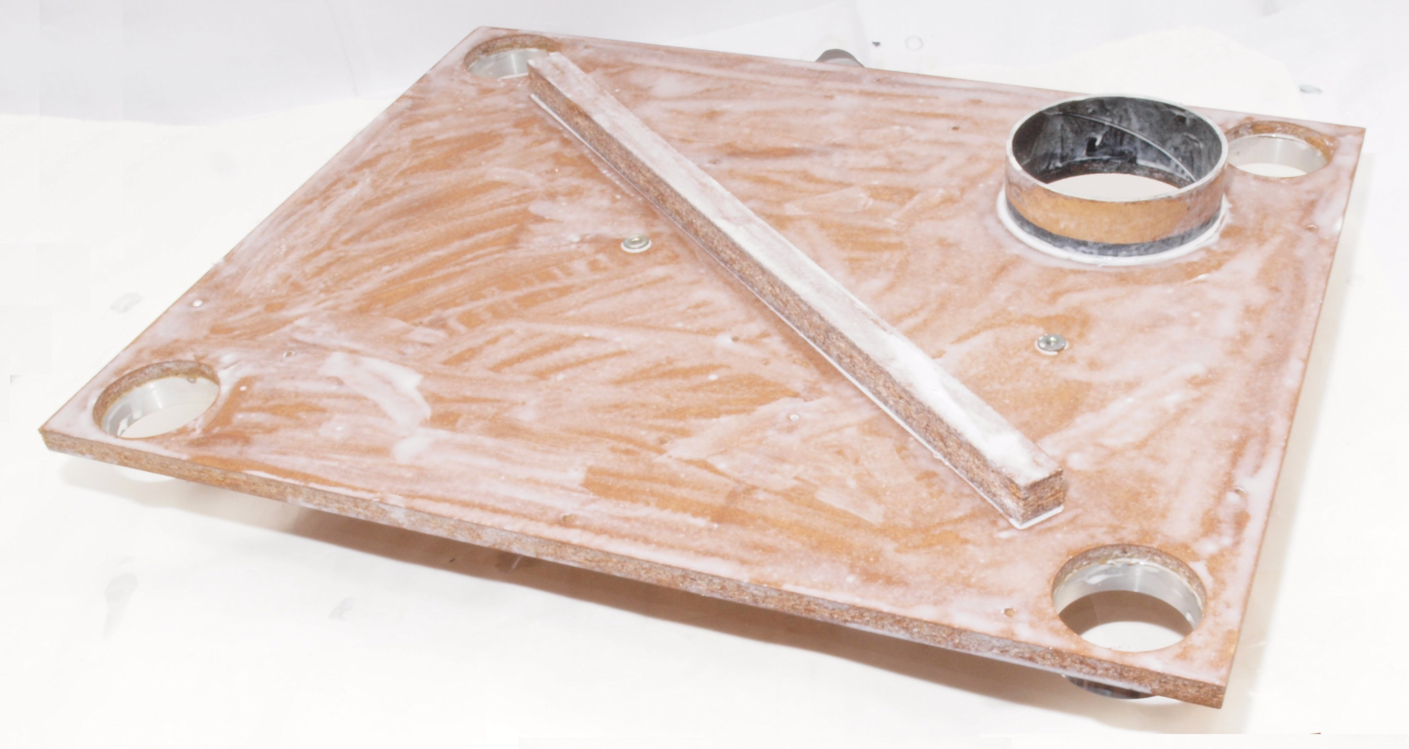 W32. 修理中 本体木枠下。 圧縮材にボンドを染みこませる、ネジ穴も塗る。