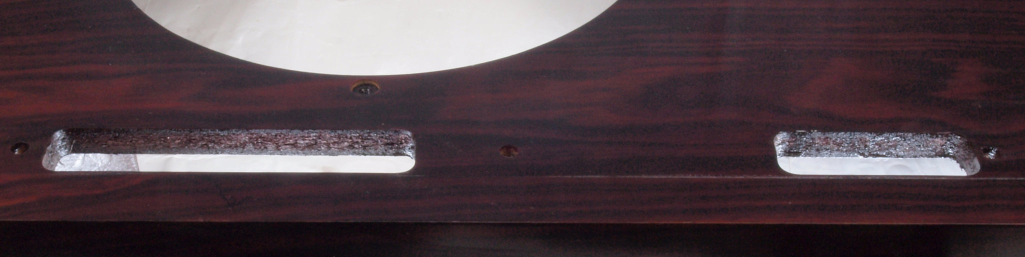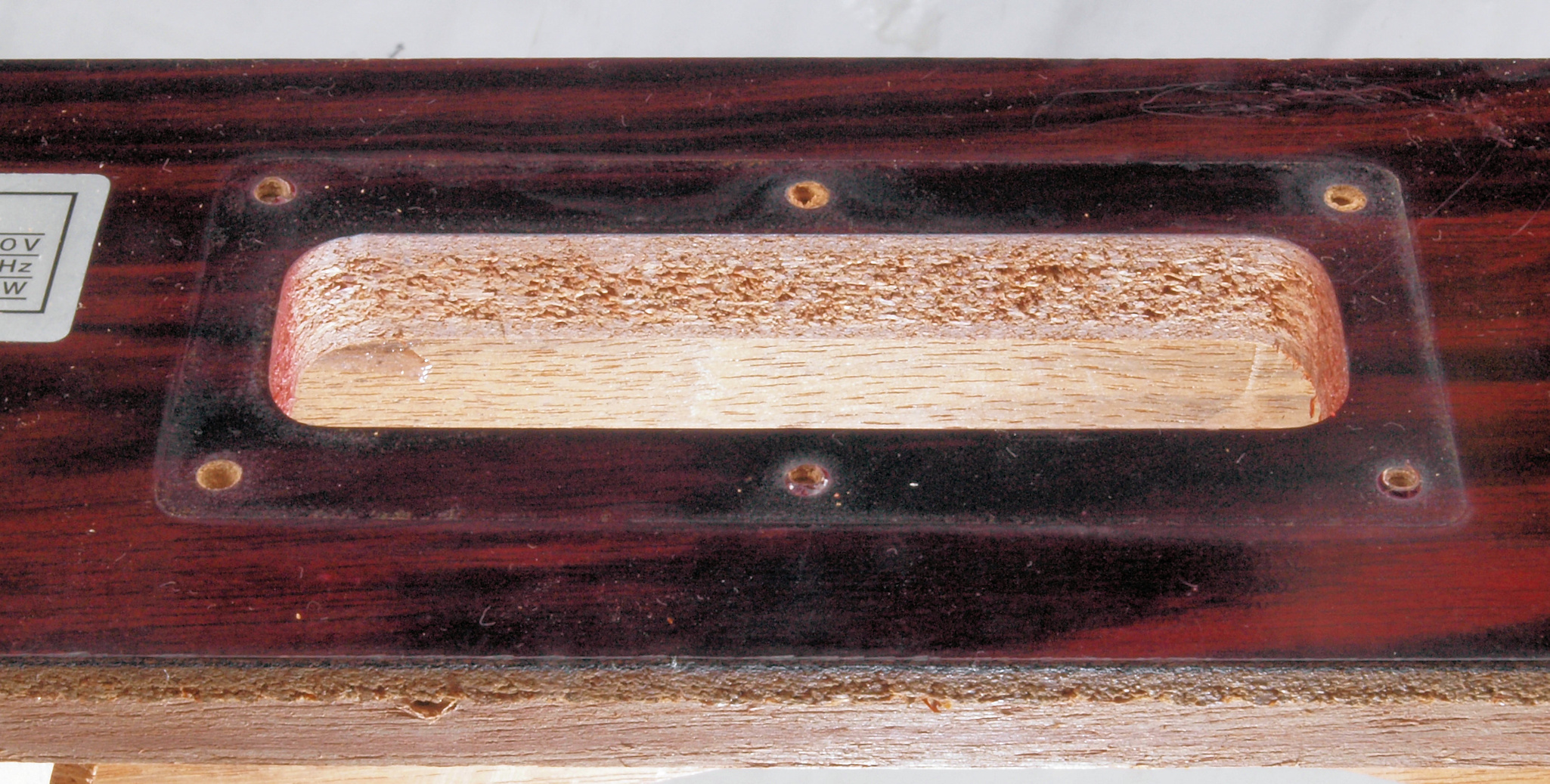W22. 修理後 操作部取付穴。 圧縮材にボンドを染みこませる、更にペンキを塗る。