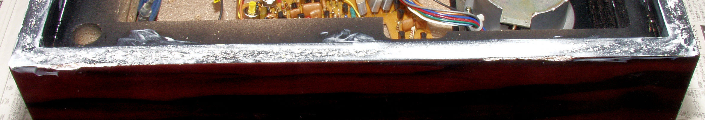 | M77. 修理中 外箱後下側拡大、水性木工ボンドを塗布乾燥 | ||||||||||||||||||||||||