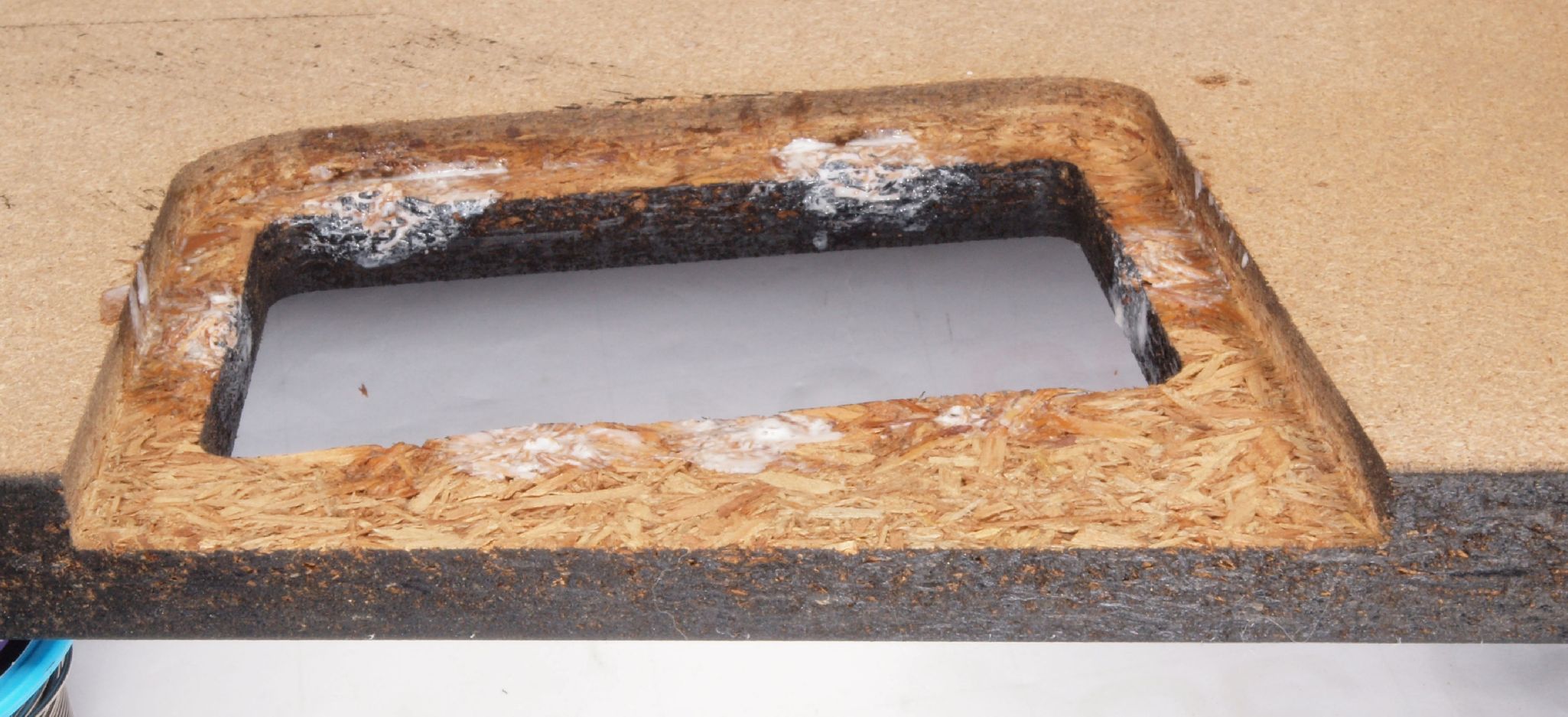 W22. 修理中 操作部取付穴。 圧縮材にボンドを染みこませる。