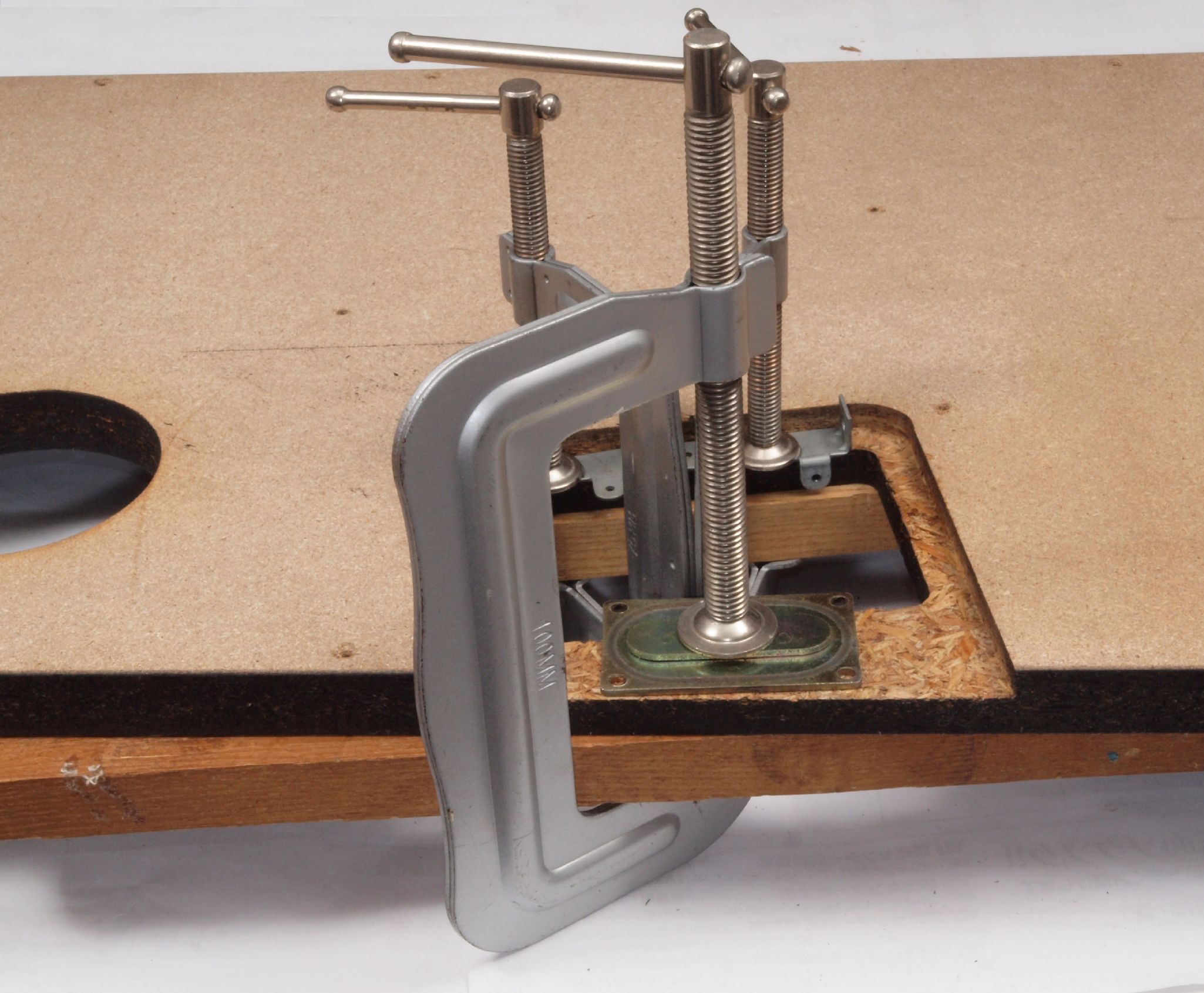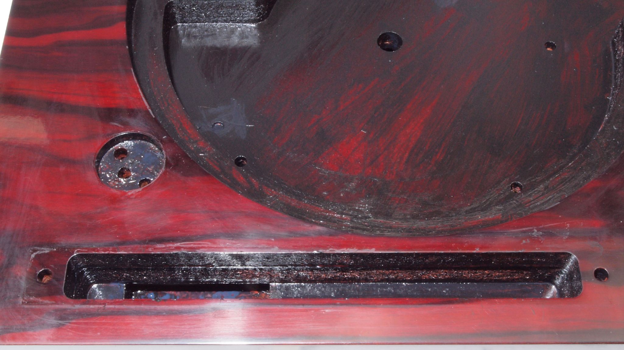W76. 修理中 下蓋のトランスカバー取り付穴。万力で締める。