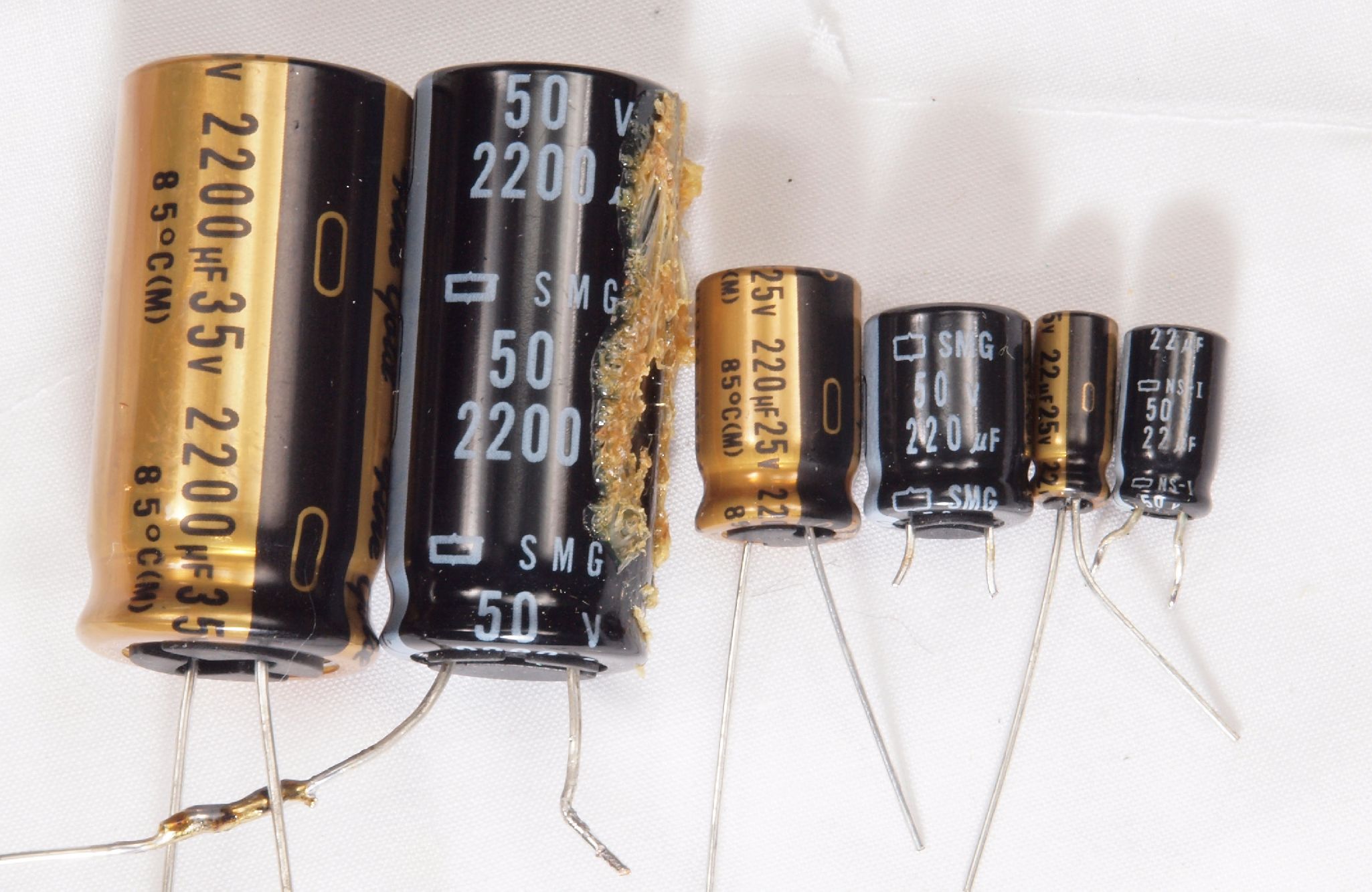 C212. 修理中 電源・33/45切替基板。 電解コンデンサー比較。左=本来の規格、右=付いていた物。