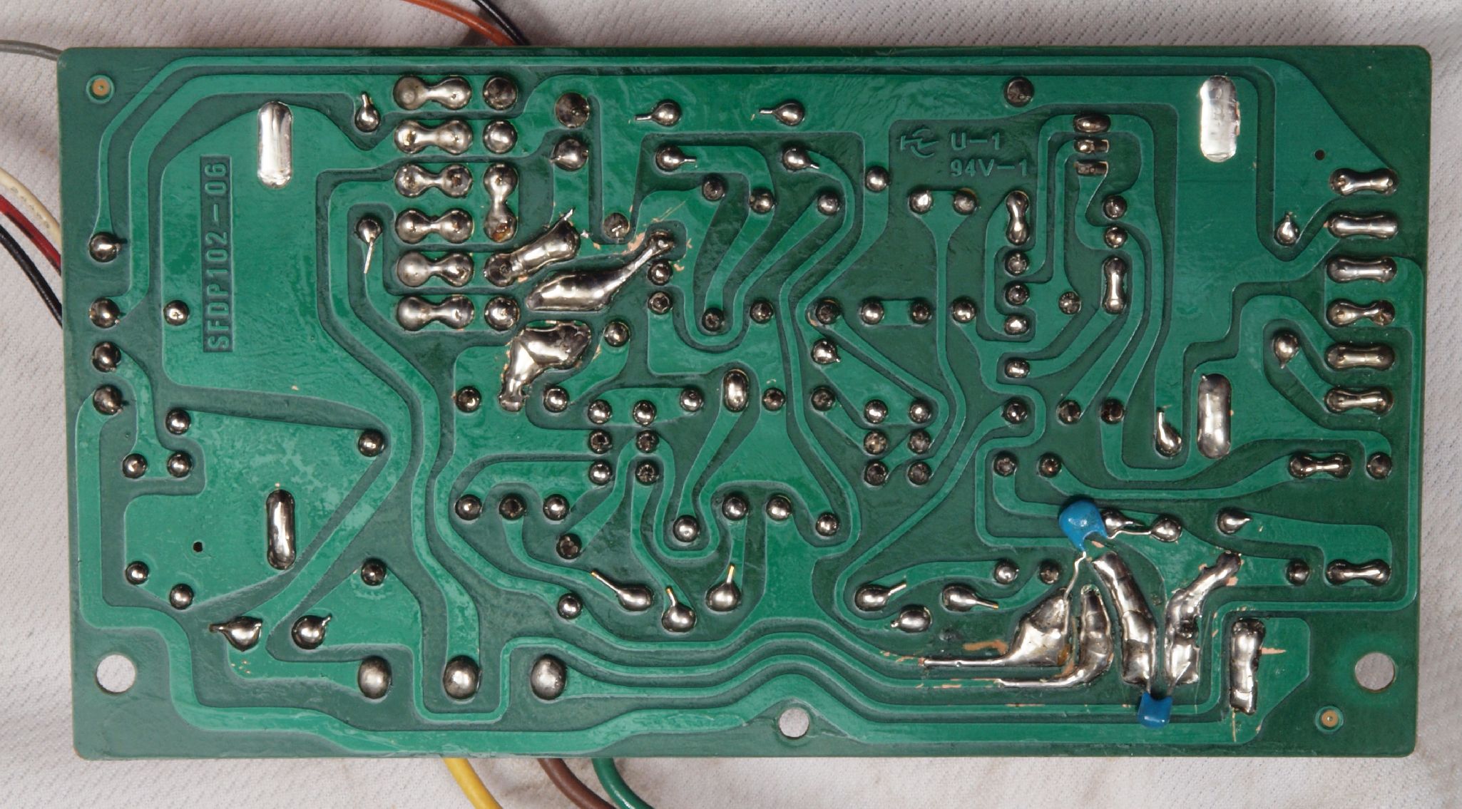 C14. 修理(半田補正)後 電源定電圧基板裏。全ハンダをやり直す。フイルムコンデンサー2個追加。
