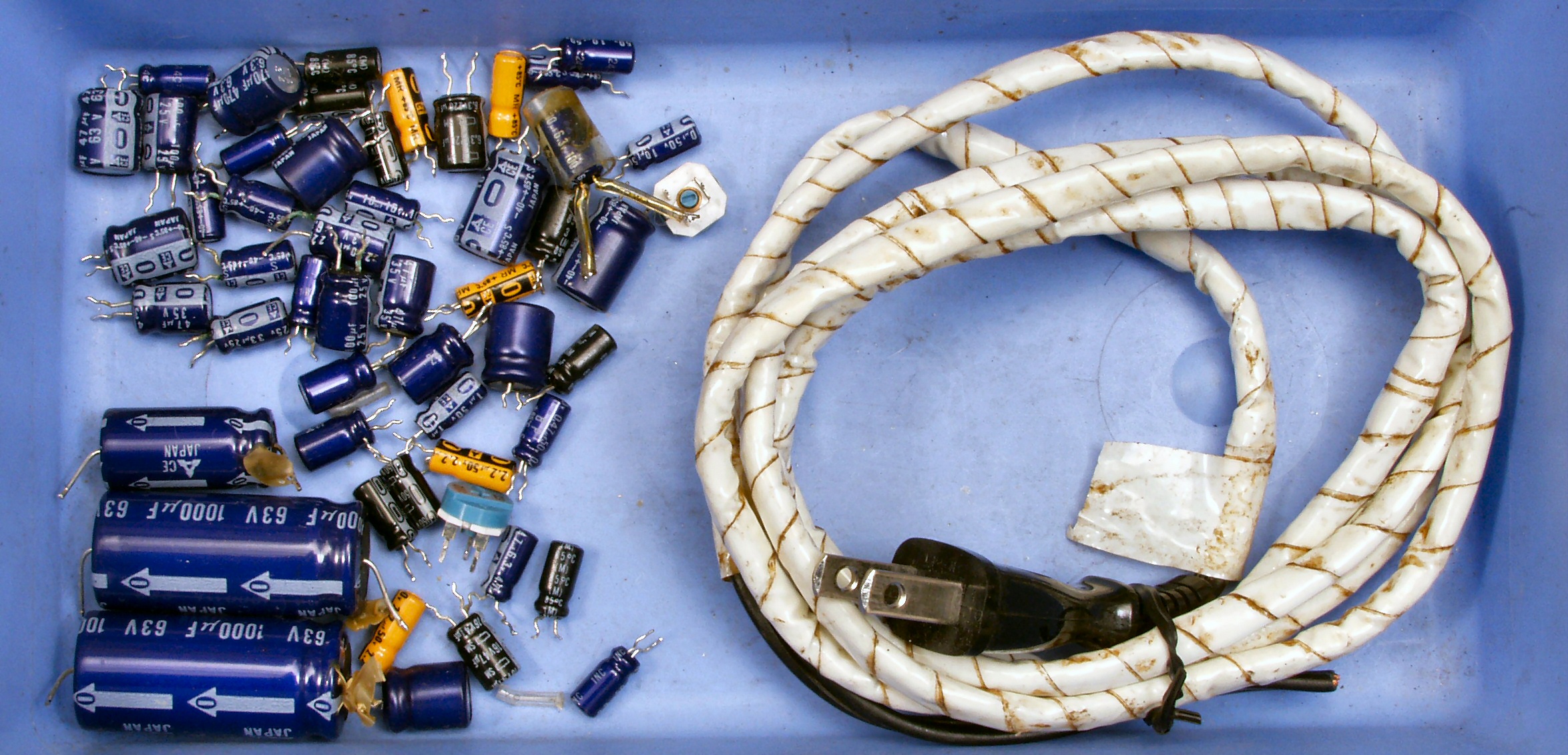| C−CB. 交換部品。 液漏れして、足の付け根より「緑青」が出ている電解コンデンサー。 | ||||||||||||||||||||||||||||||||||||||
