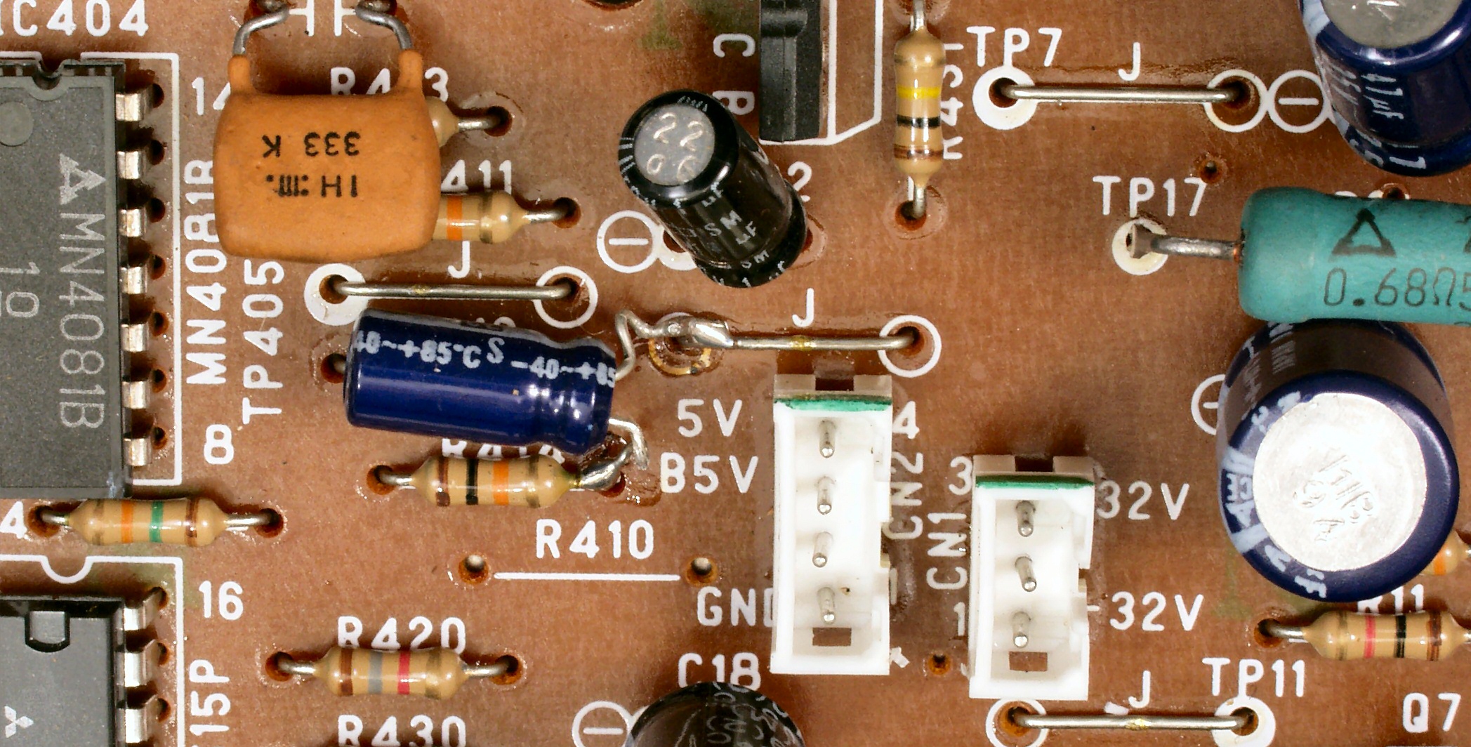 | C−2A−1. 修理前 定電圧回路基板、手直しで取り付けた電解コンデンサー | ||||||||||||||||||||||||||||||||||||||
