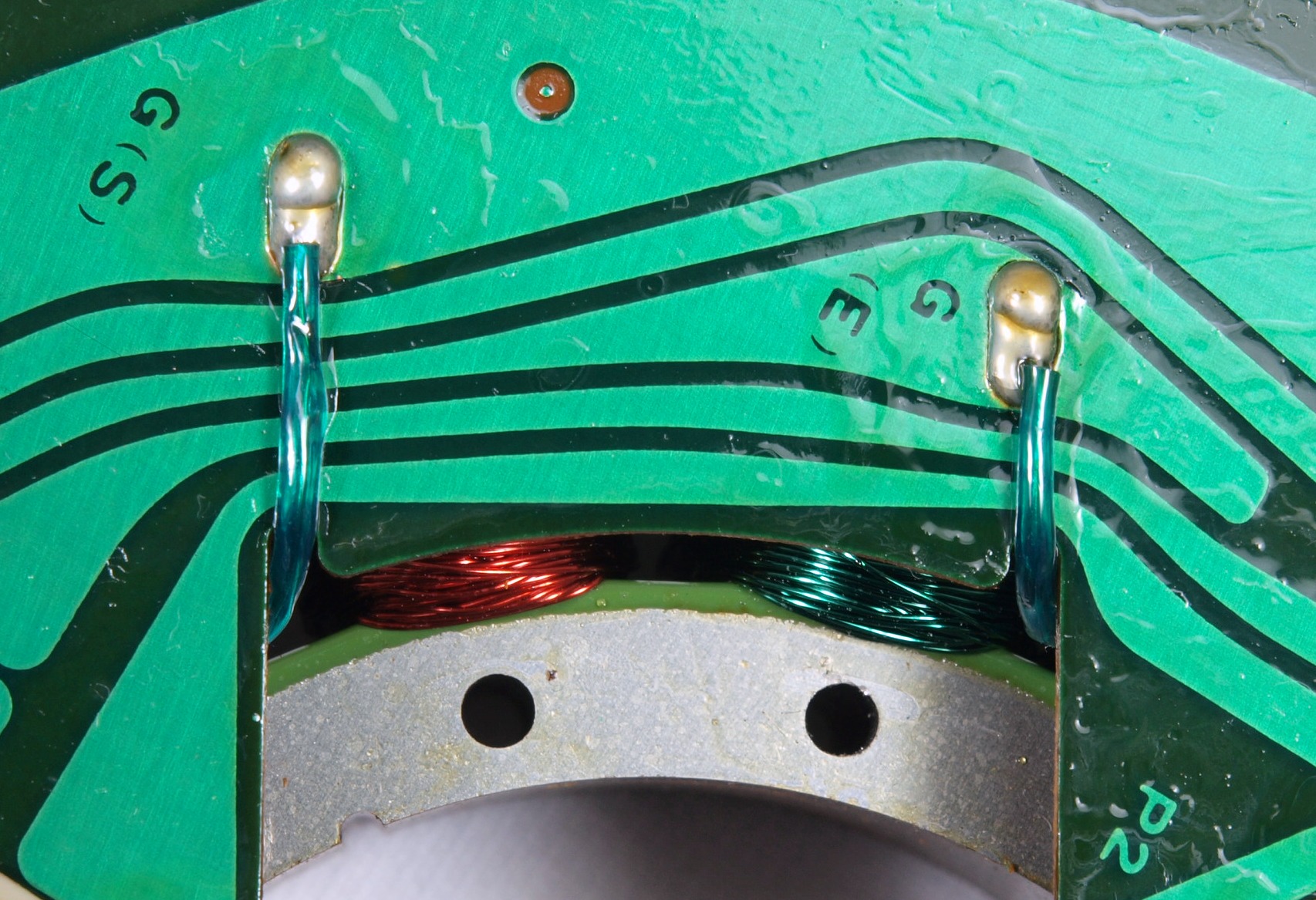 | M413. 修理中、 アマチュア(回転子)基盤裏巻線半田、引き出し線が絶縁していない!(BLUE巻線)拡大 | ||||||||||||||||||||||||||||||||||||||||
