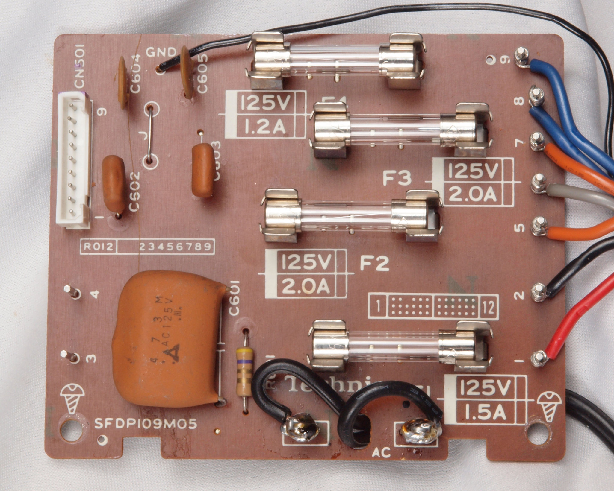 | C612. 修理前 ヒューズ基板。電源コードハンダ付け。 | ||||||||||||||||||||||||||||||||||||||||