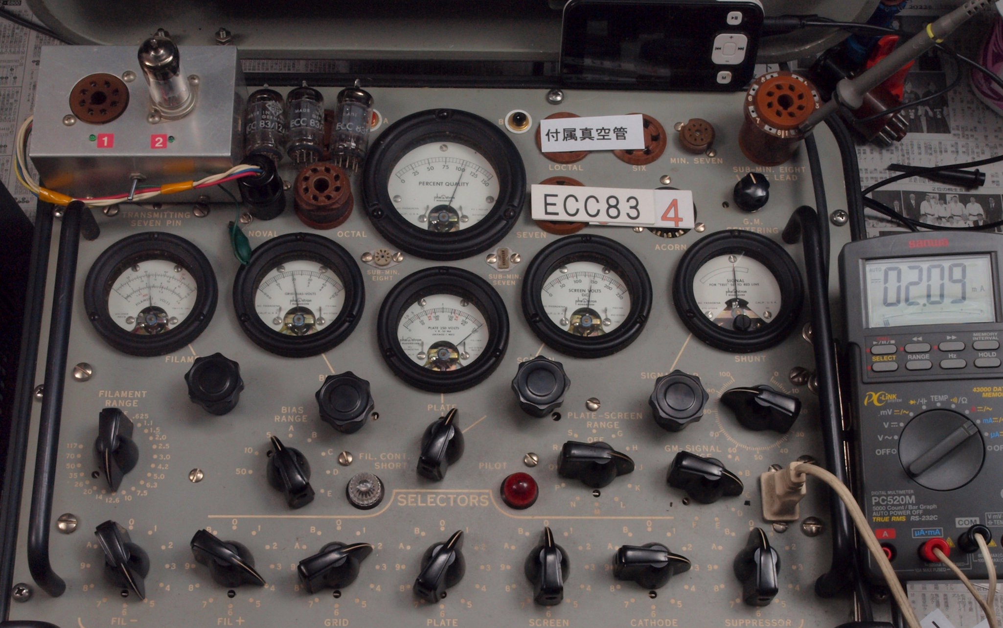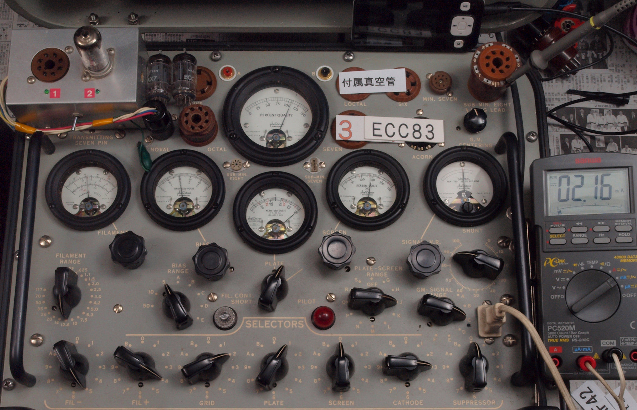 | J11. 付属1本目 12AX7 ユニット1。 Gm測定=1700μmho、IP=1.49mA。 Cレンジ=3000μmhoレンジでの測定、「Ep=250V、Eg1=−2V」 |