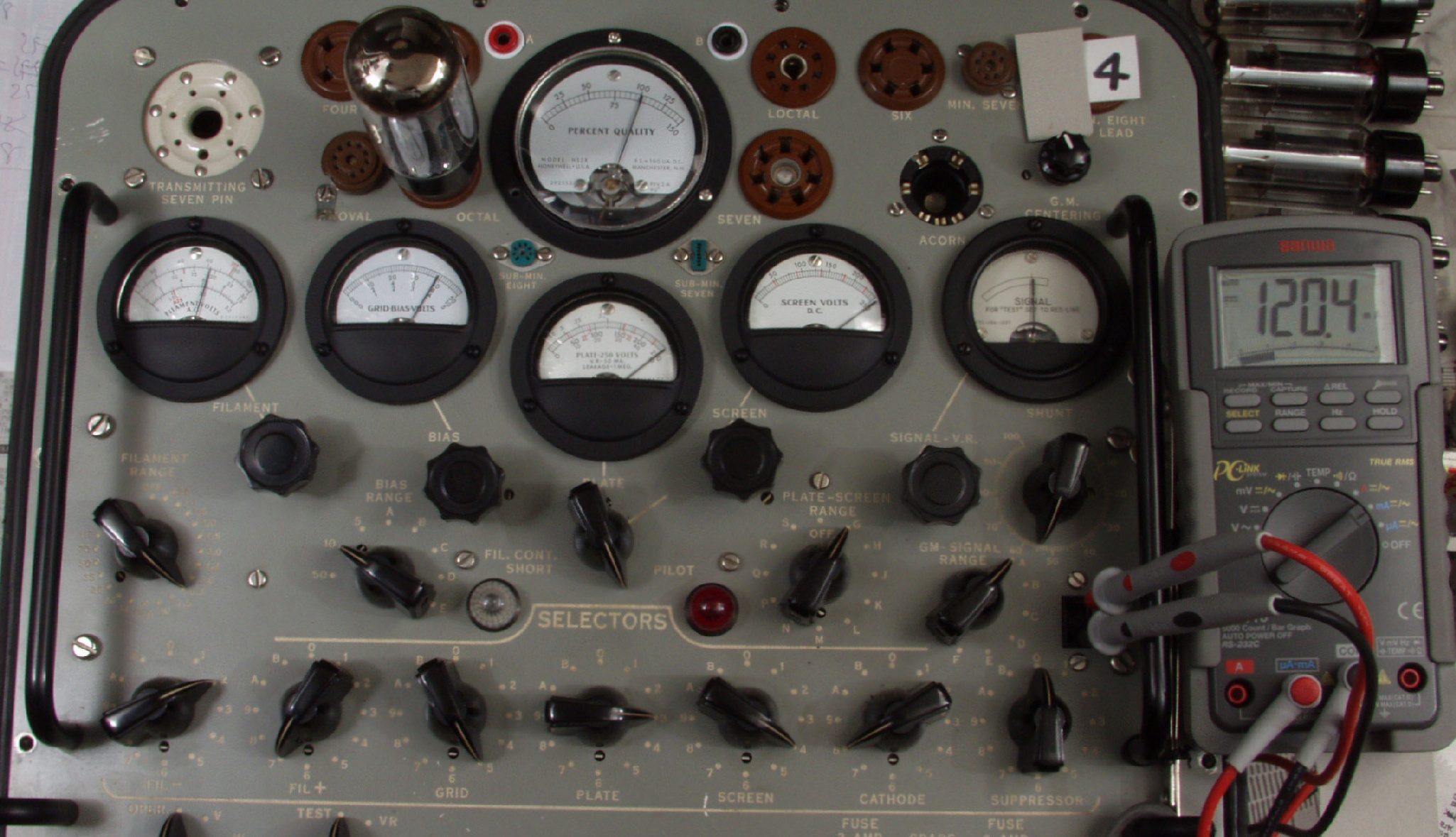 | K1. 1本目 6G-B8 測定。 Gm=20000μmho、Ip=115.1mA。RangeSW=A、FullScale=30000μmho。 測定条件、 「Ep=250V、Esg=250V、Eg1=−8V」 |