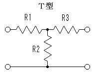 | 良く用いられるT型のアッテネーター回路。 各抵抗値は24系列で近いのを選びます。