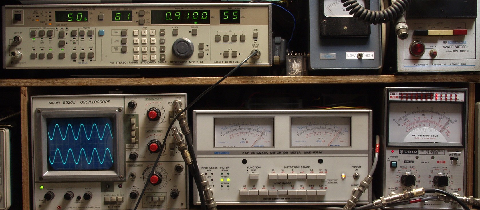 | E4B. AM 感度測定調整 見方 上のAM信号発信器より 910KHZで 1KHZの 50%変調信号を 55dBで出す これを受信し出力を測定する、 下中=歪み率計=1%、左メータ=L出力、右メータ=R出力(最大1%レンジ) 下右=電圧測定器、赤針=R出力=1V、黒針=L出力(最大1Vレンジ) 下左=出力波形 上=R出力、下=L出力。 |