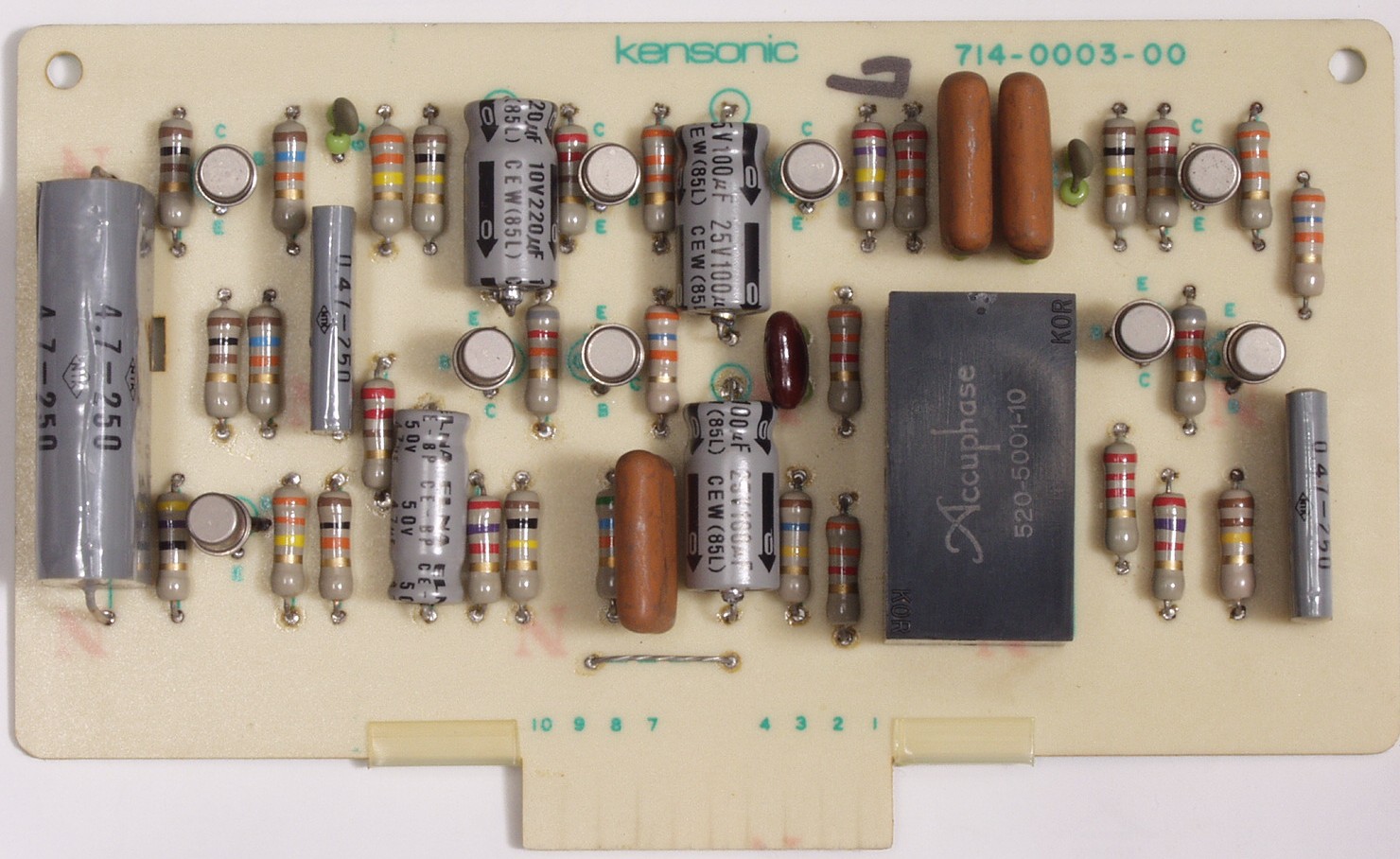 | C72. 修理後 R出力AMP基板 電解コンデンサー4個、フイルムコンデンサー4個、TR(トランジスタ−)9個交換 |