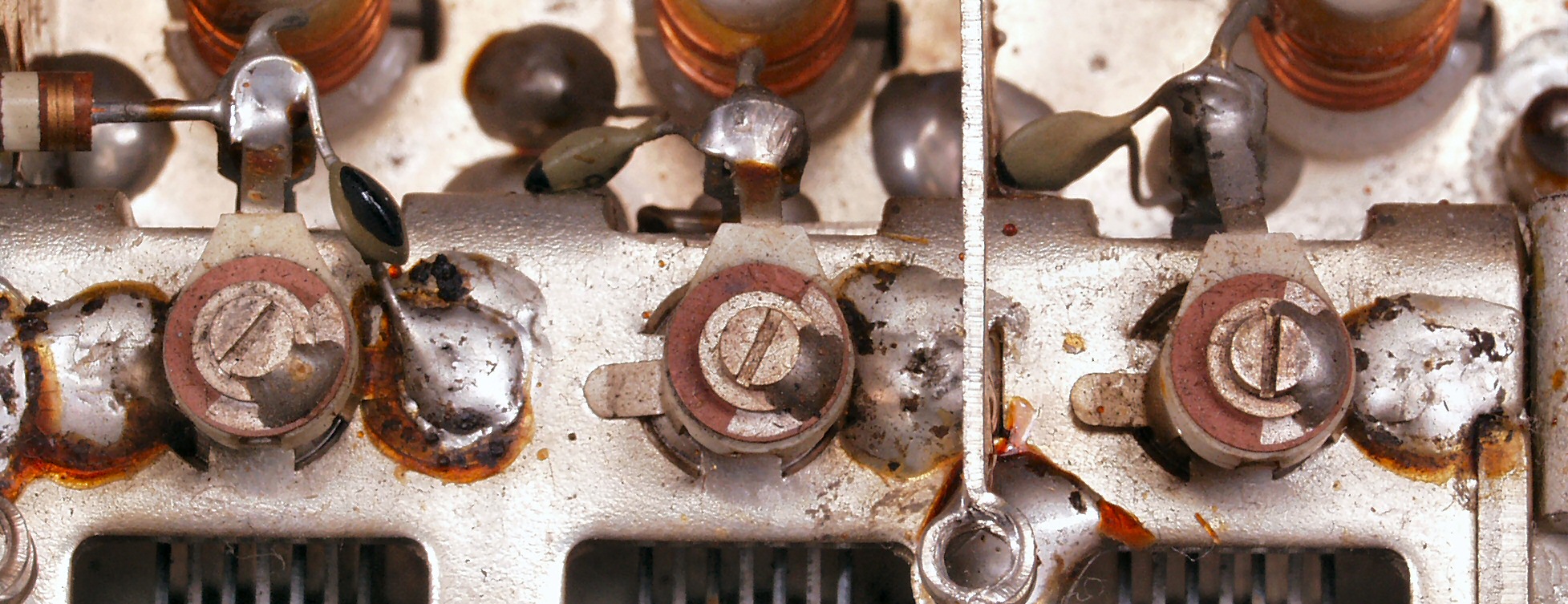 | A. 修理前の状況。 画像をクリックすると、大きく(横幅2050ドット)表示されます。 A1. 修理前点検中 上から見る、ダイアル・ランプが交換してある |