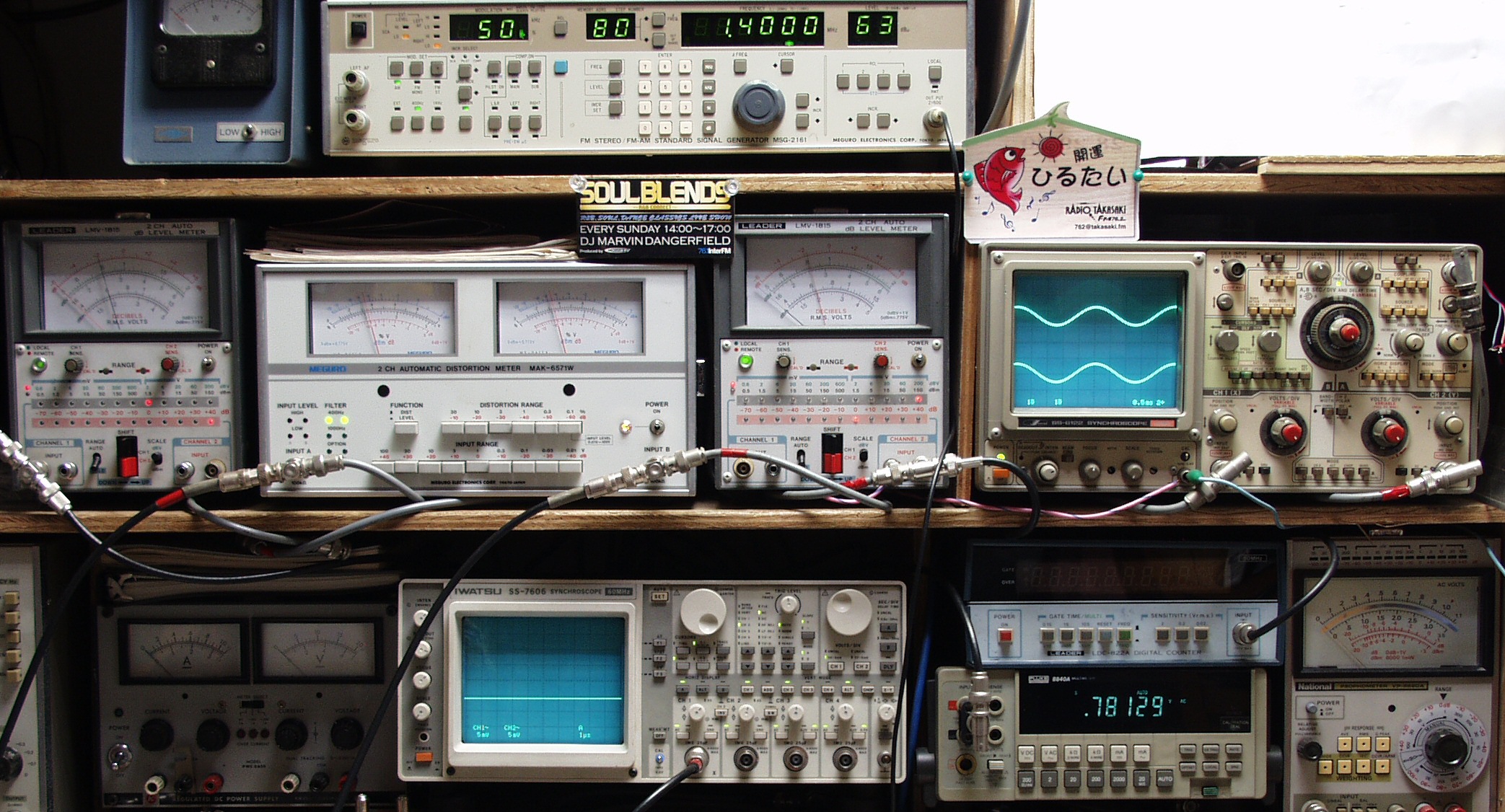 | E. 測定・調整。 画像をクリックすると、大きく(横幅2050ドット)表示されます。 E0. FM受信感度、歪み、分離度測定調整 <見方> 上段右=AM・FMステレオ信号発信器 中段左端 電圧計=L側出力電圧測定、黒針のみ使用 中段中左 歪み率計=出力の歪み率測定 左メータ=L出力、右メータ=R出力 中段中右 電圧計=R側出力電圧測定、赤針のみ使用 中段右端 オシロ=出力波形 上=R出力、下=L出力 RL電圧計の出力を測定しているのでレンジが異なる場合比較注意 下段中右上 デジタル電圧計=出力電圧測定RLは切り替えて測定 |