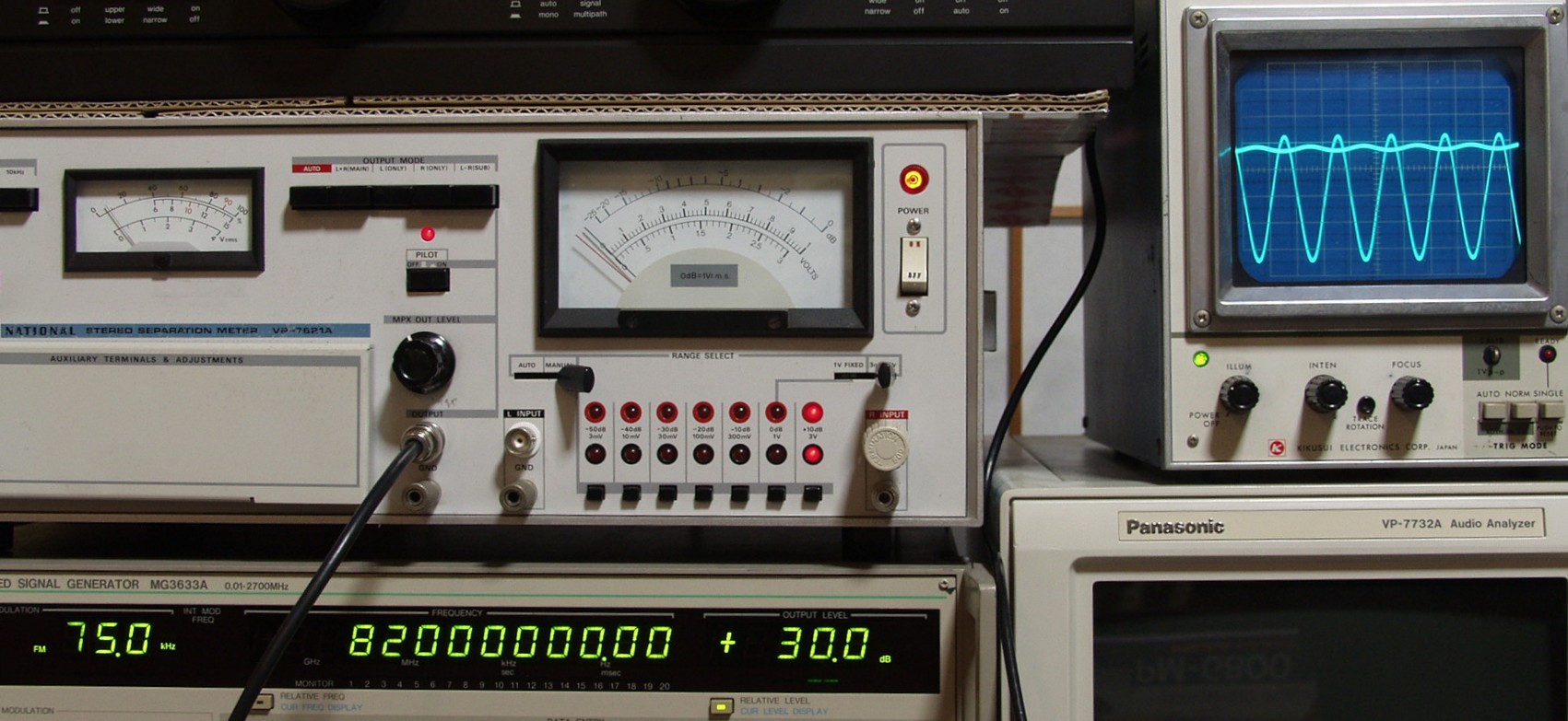 | E. 調整・測定 E1. 感度測定調整 機器の機能 左中=FMステレオ信号発信器 左=高周波信号発信器 右上=オシロ(上=R出力、下=L出力) 下左側=歪み率計(上=R出力、下=L出力) |