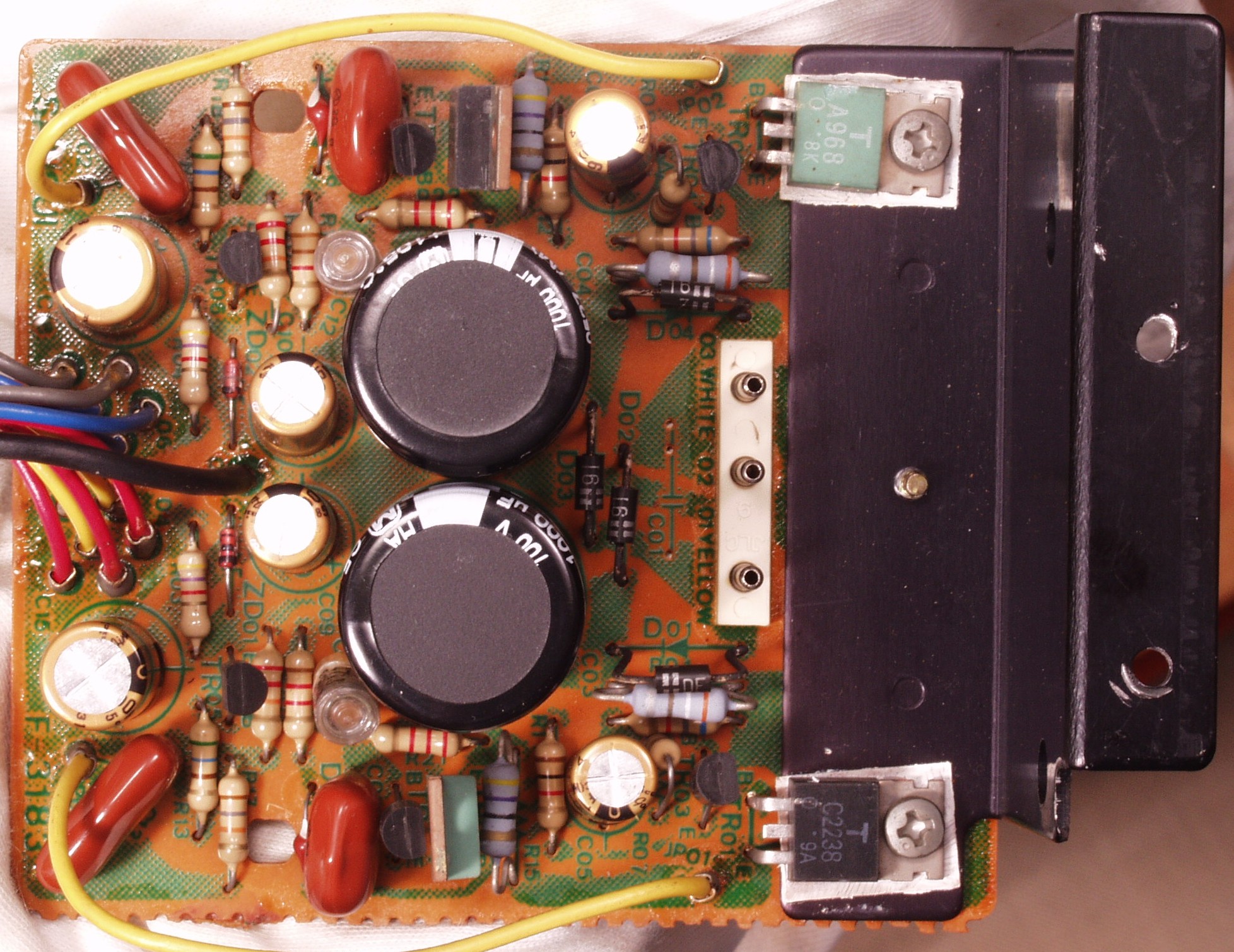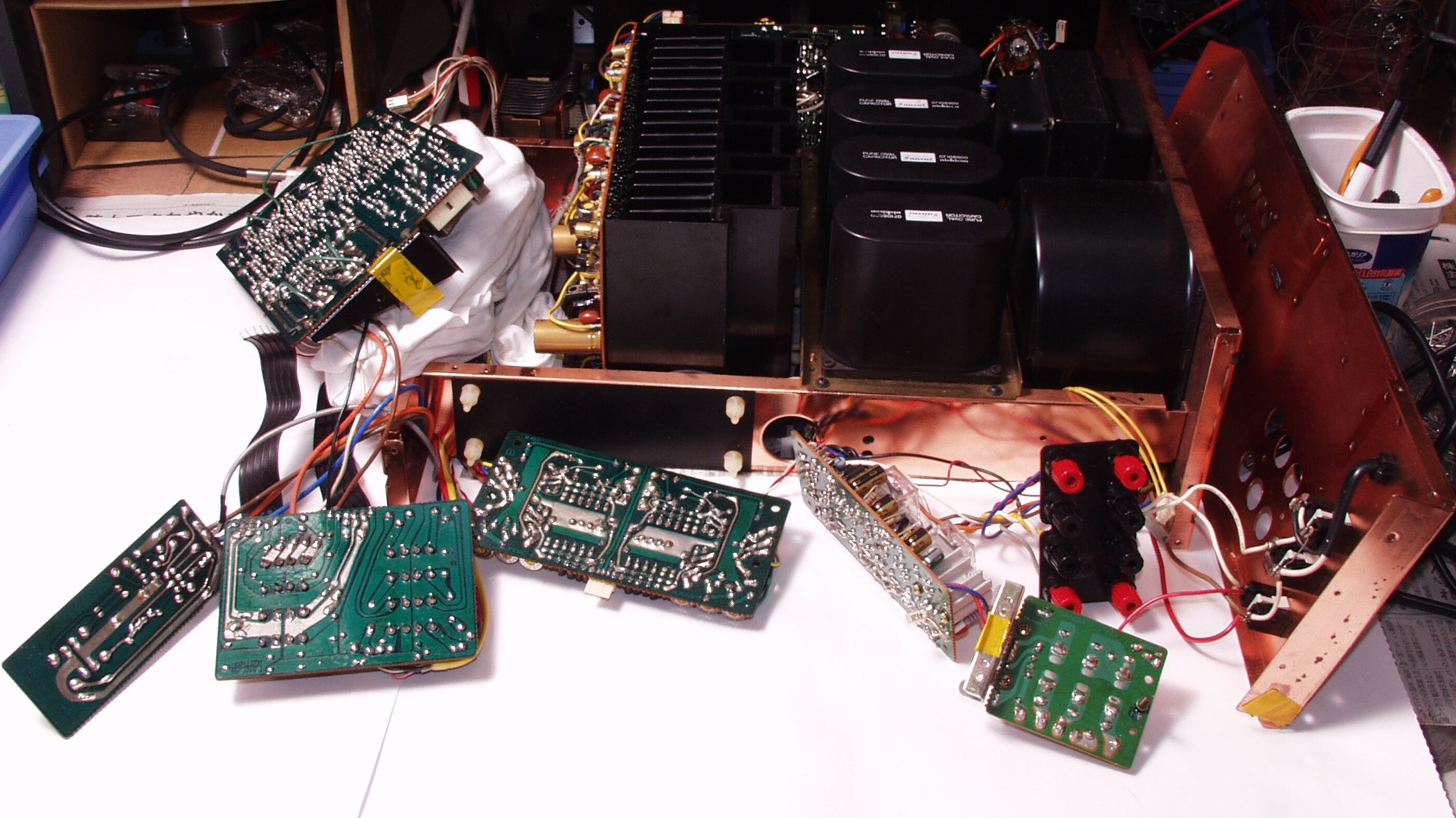 初段FET(電界効果トランジスター)2個、半固定VR4個、電解コンデンサ−20個、抵抗6個、TR(トランジスター)6個交換