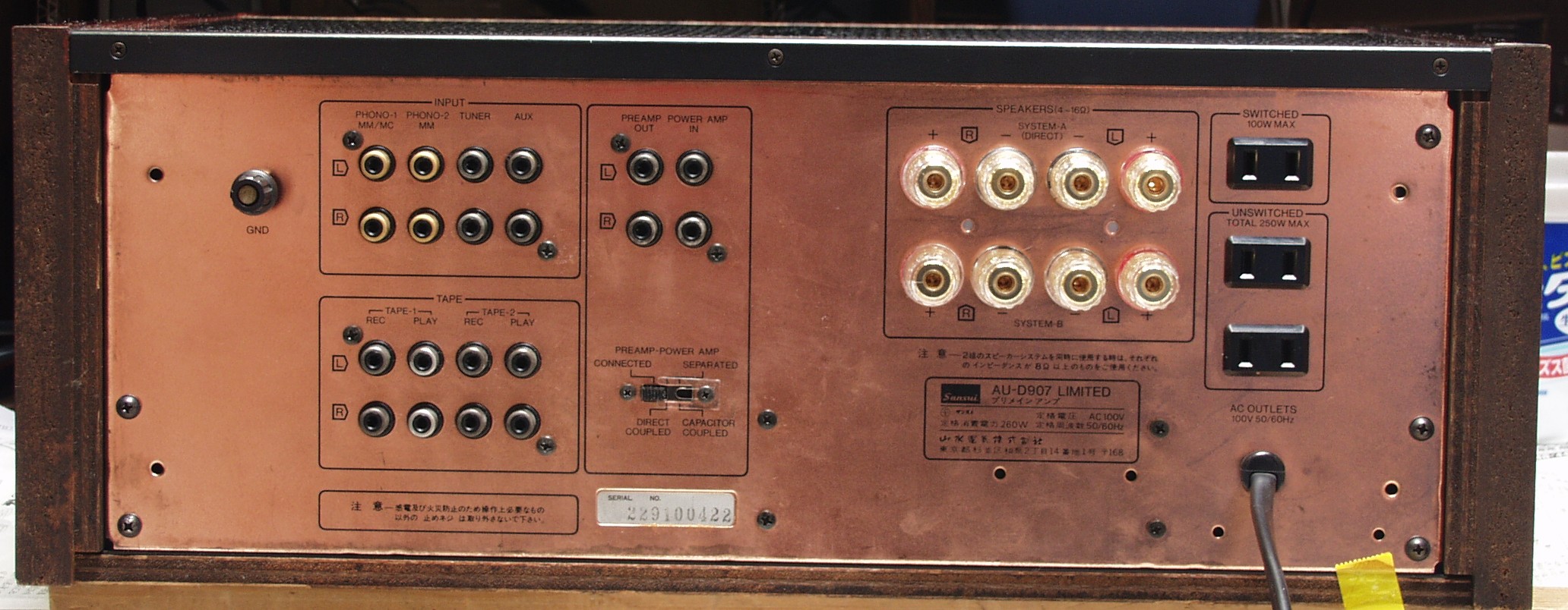 E−2C. L−SP出力=30V=112W 歪み率0.03% at=1000HZ AUX端子入力