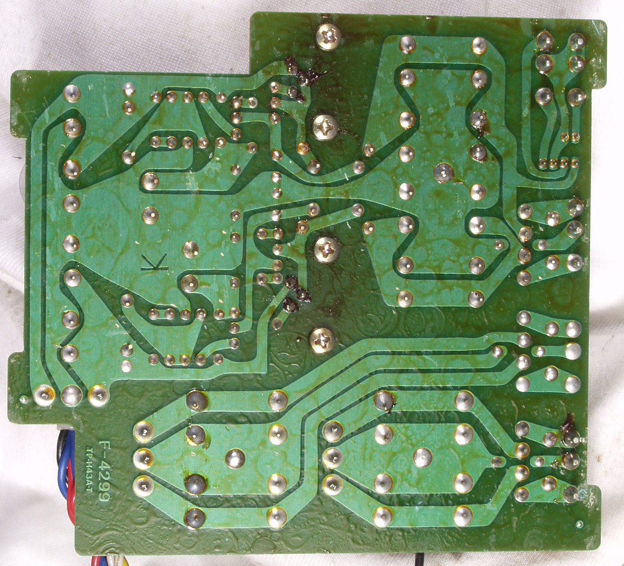 | C−6C−1. 修理中 製作仕様書が悪く、ジャンパー線が基板の他のラインの上にある、絶縁は塗料のみ 制作者は何も考えず、内側に曲げるだけ |