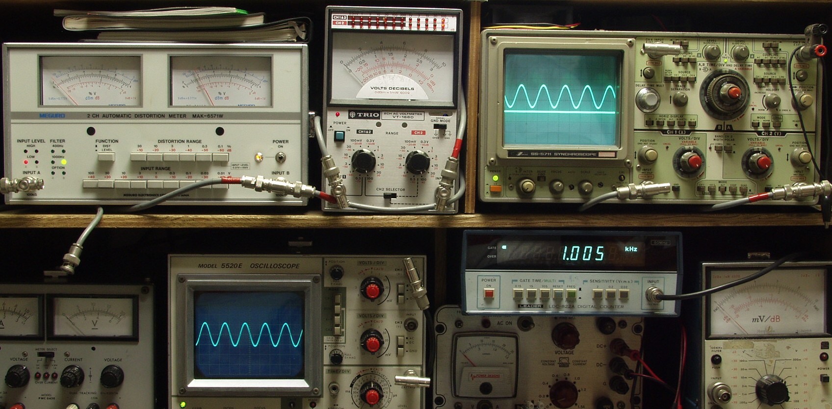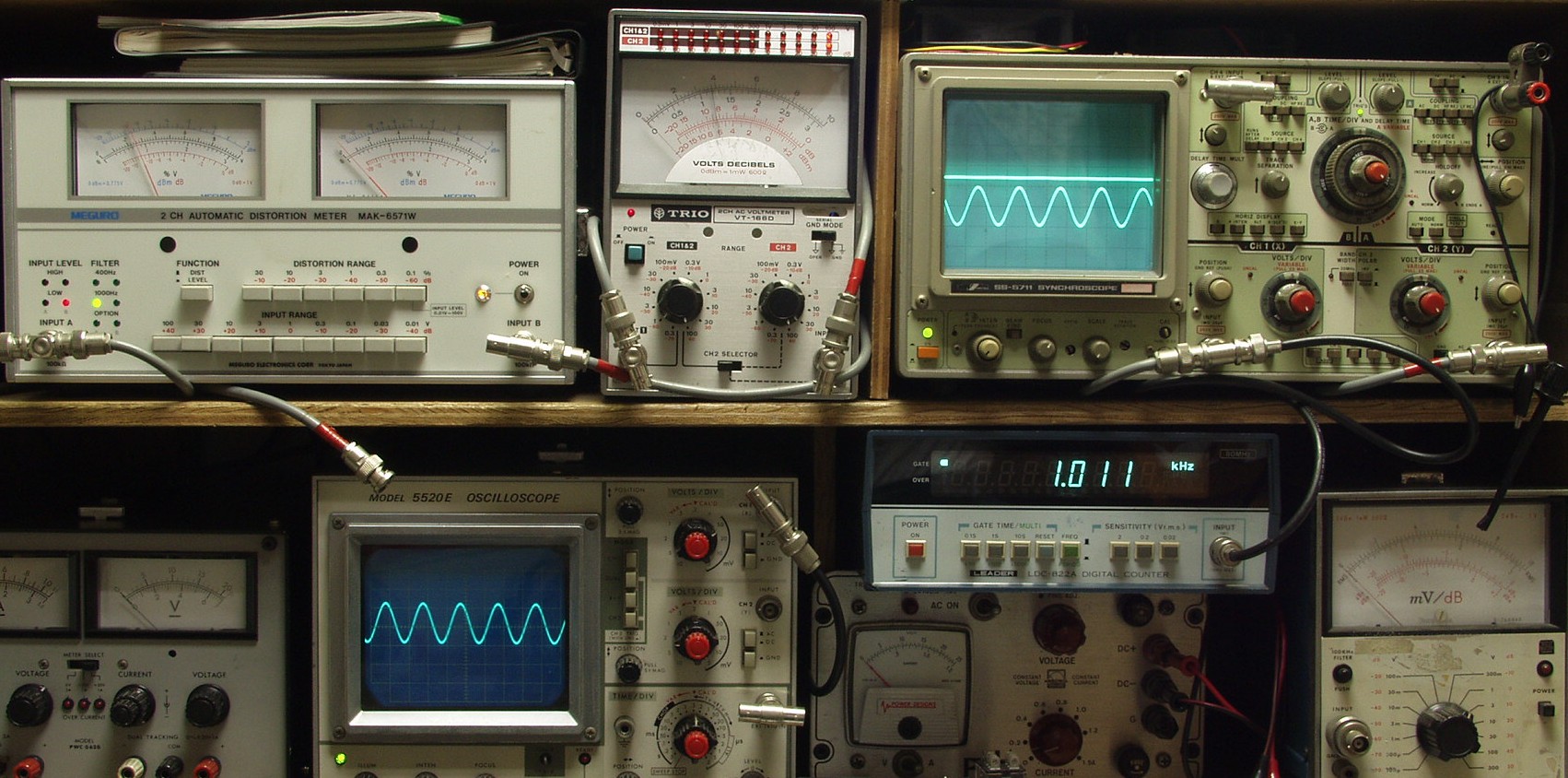 | E. 調整・測定 E−1. 調整後の出力/歪み率測定 <見方> 上左オーディオ発振器より400HZ・1KHZの信号を出す(歪み率=約0.005%) 下中=入力波形(オーディオ発振器のTTLレベル) 下右=周波数計 上左=SP出力の歪み率測定 左メータ=L出力、右メータ=R出力 上中=SP出力電圧測定器、赤針=R出力、黒針=L出力 上右=SP出力波形オシロ 上=R出力、下=L出力(出力電圧測定器の出力) |