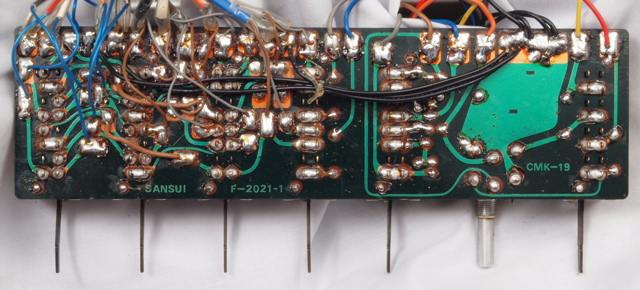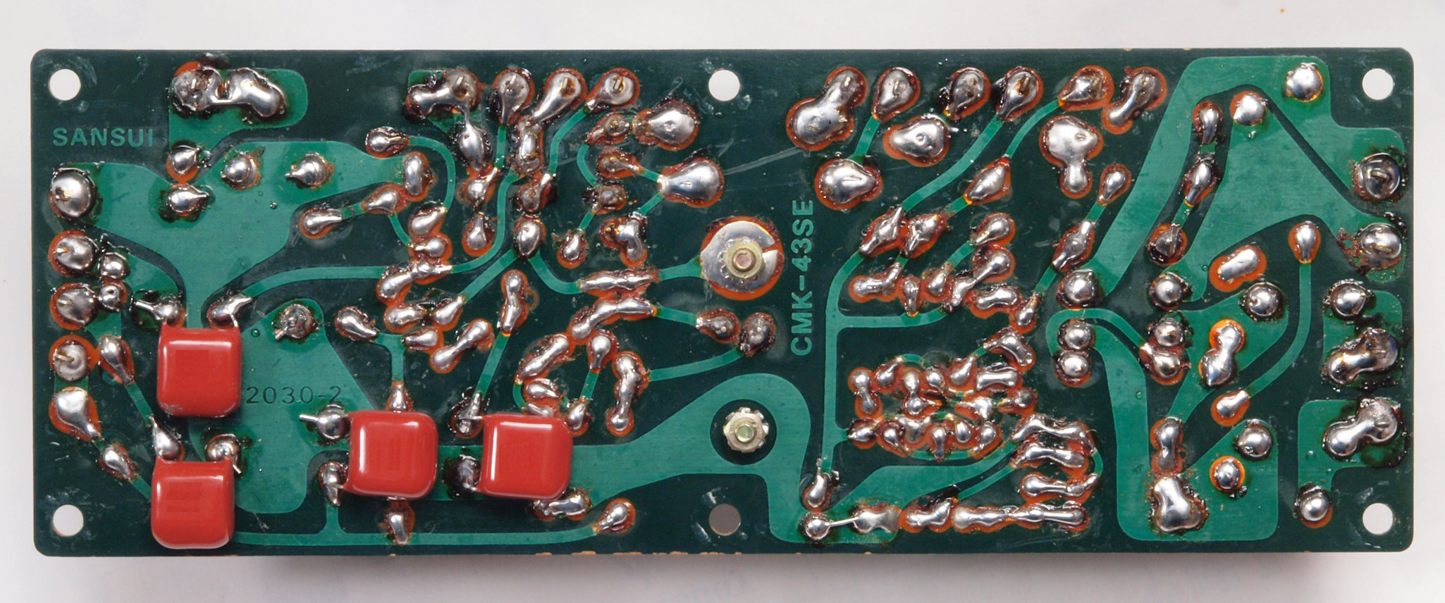 | C61. 修理前 EQ−AMP基板。 TR(トランジスター)が4個交換されている。 | ||||||||||||||||||||||||||||||||||||||||||