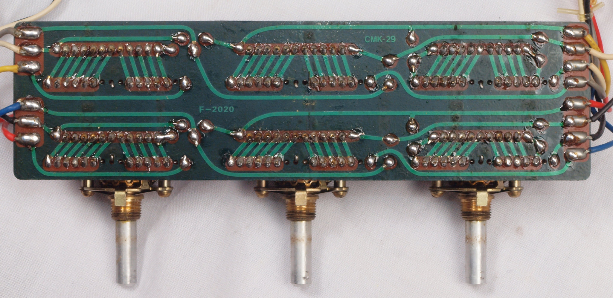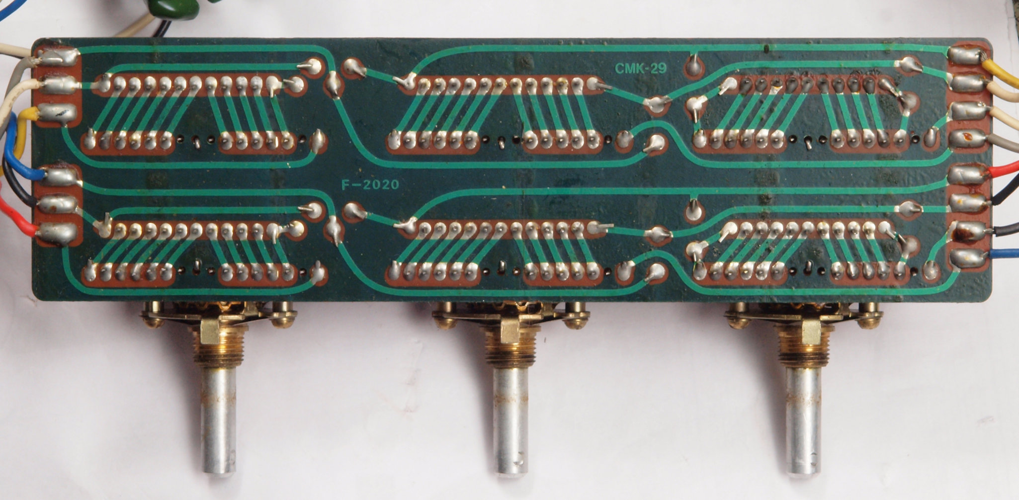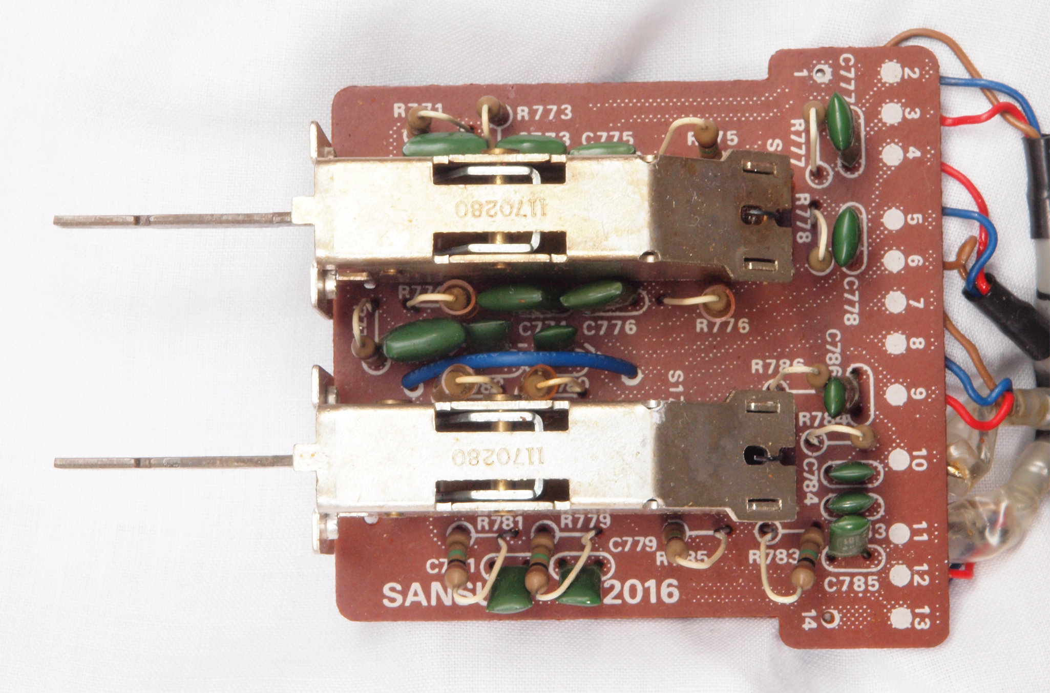 | CJ2. 修理中(洗浄)中 TAPE1入力VR、TEAP2入力VR,AUX入力VR基板裏。軸を上に向けて洗浄する。 | ||||||||||||||||||||||||||||||||||||||||||