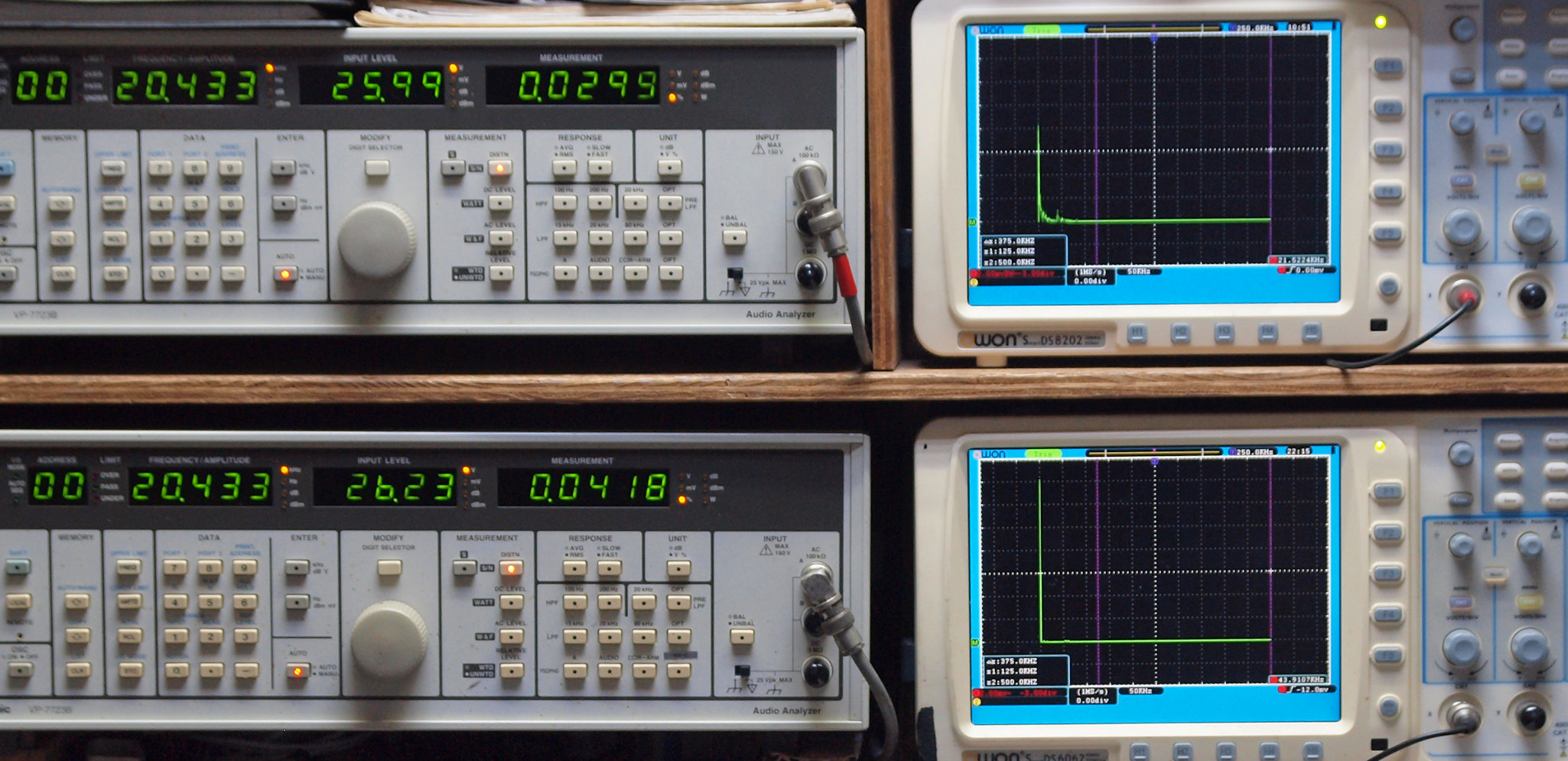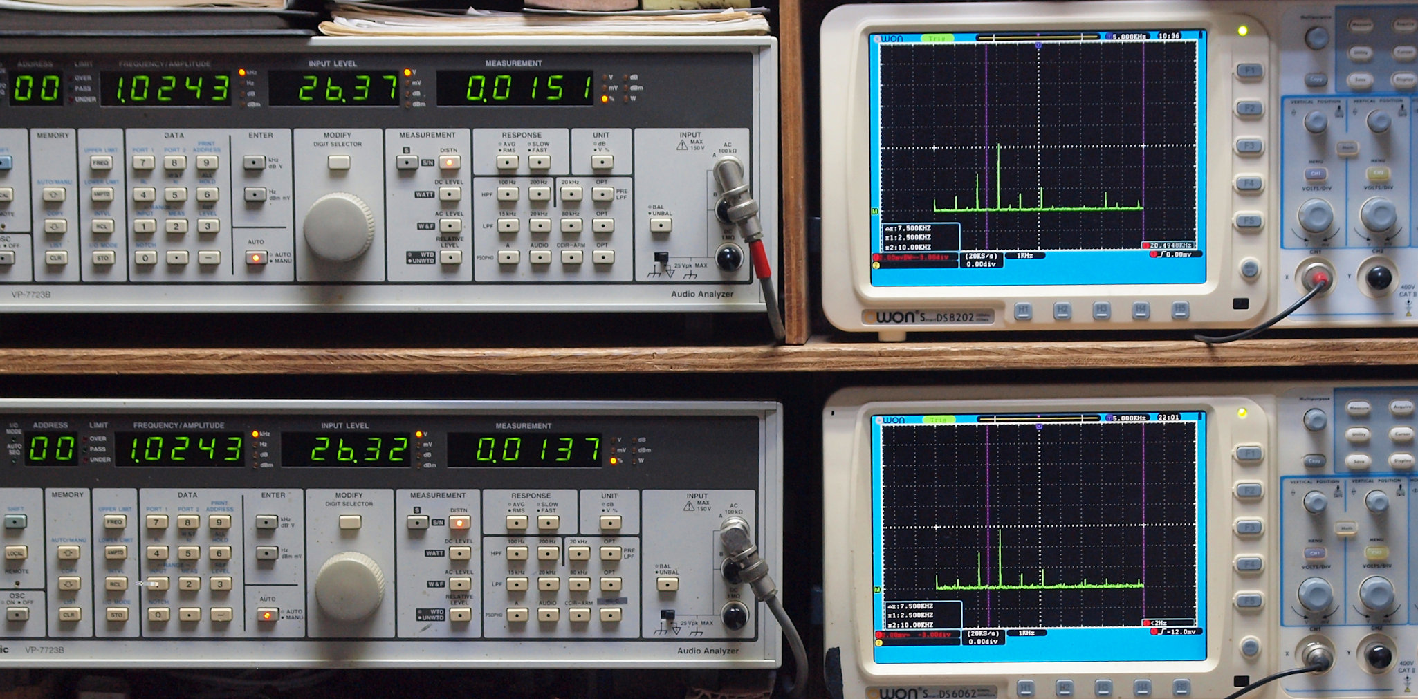 | E. 測定・調整。 画像をクリックすると、大きく(横幅2050ドット)表示されます。 E0. 出力・歪み率測定・調整 「見方」。 上段中 右側SP出力を「Audio Analyzer Panasonic VP−7723B」により測定。 表示LED、 左端=メモリーNo、 中左=周波数測定、 中右=出力電圧測定、 右端=歪み率測定。 上段右端 VP−7723Bの基本波除去出力を「owon SDS8202(200MHZ)」で「FFT分析」表示。 下段中 左側SP出力を「Audio Analyzer Panasonic VP−7723B」により測定。 表示LED、 左端=メモリーNo、 中左=周波数測定、 中右=出力電圧測定、 右端=歪み率測定。 下段右端 VP−7723Bの基本波除去出力を「owon SDS6062(200MHZ)」で「FFT分析」表示。 下段左端 オーディオ発振器 VP−7201A より50Hz〜100kHzの信号を出し(歪み率=約0.003%)、ATT+分配器を通し、AMPに入力。 よって、ダイアル設定出力レベルより低くなります。測定機器の仕様や整備の様子はこちら、「VP−7723B」「VP−7201A」。 FFT画面の見方はこちら。 |
