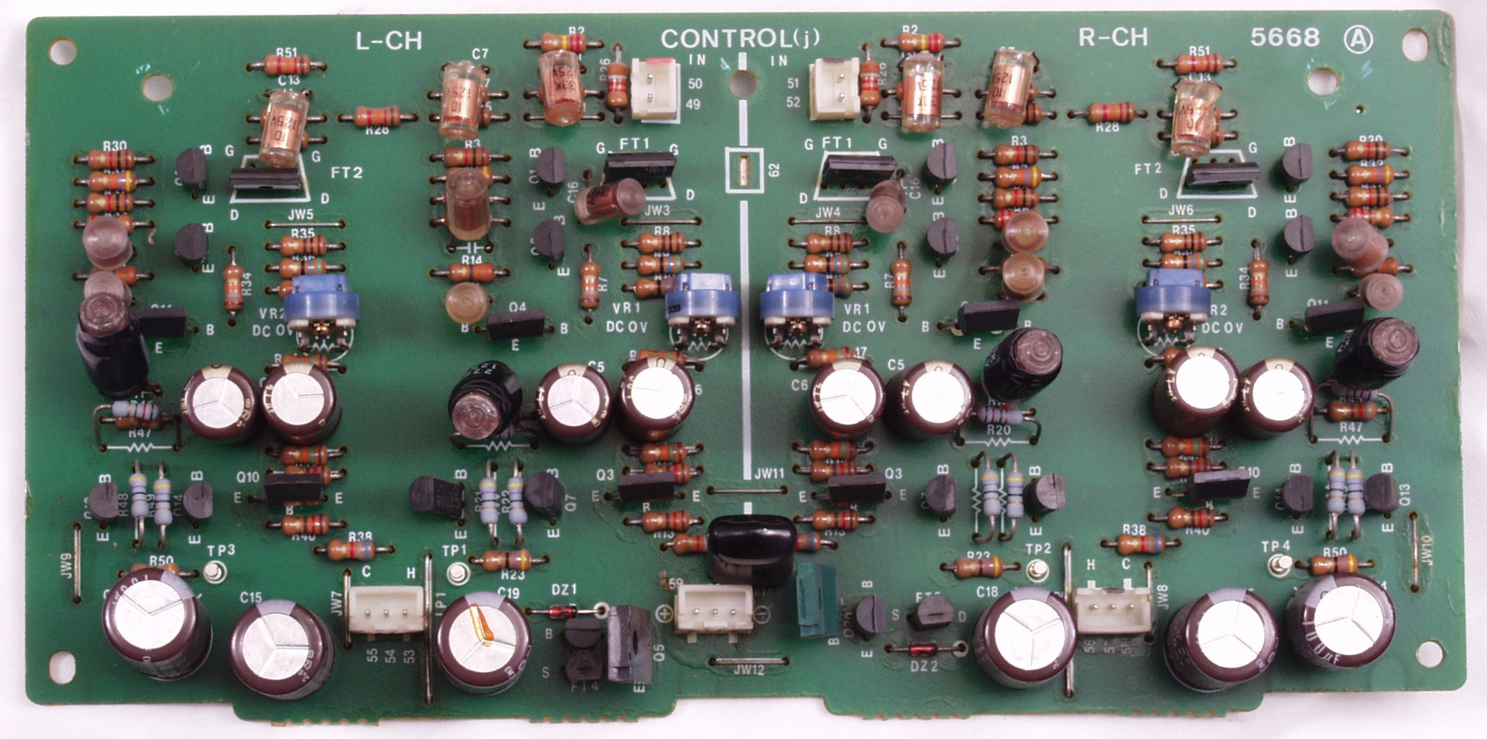 | C52. 修理後 コントロール基板T 音が通る結合(カップリング)コンデンサーは、BPコンデンサーに交換したので2個→1個 電解コンデンサー14個、FET(電界効果トランジスター)4個、半固定VR4個交換 |