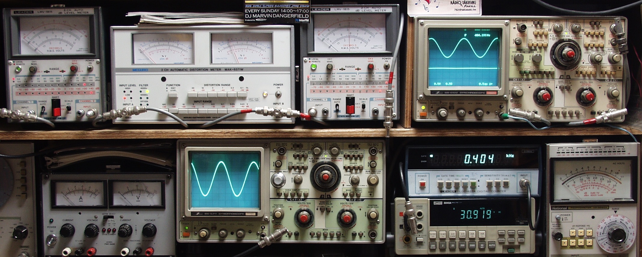 | T. 仮修理での測定。 画像をクリックすると、大きく(横幅2050ドット)表示されます。 T0. 出力・歪み率測定・調整 <見方> 下段左端 オーディオ発振器より400HZ・1KHZの信号を出し(歪み率=約0.003%)これをAMPに入力し、SP出力を測定 下段中左 オシロ=入力波形(オーディオ発振器のTTLレベル) 下段中右上=周波数計 上段左端 電圧計=L側SP出力電圧測定、黒針のみ使用 上段中左 歪み率計=SP出力の歪み率測定 左メータ=L出力、右メータ=R出力 上段中右 電圧計=R側SP出力電圧測定、赤針のみ使用 上段右端 オシロ=SP出力波形 上=R出力、下=L出力(実際にはRL電圧計の出力「Max1V」を観測) 下段中右上 デジタル電圧計=SP出力電圧測定RLは切り替えて測定 |
