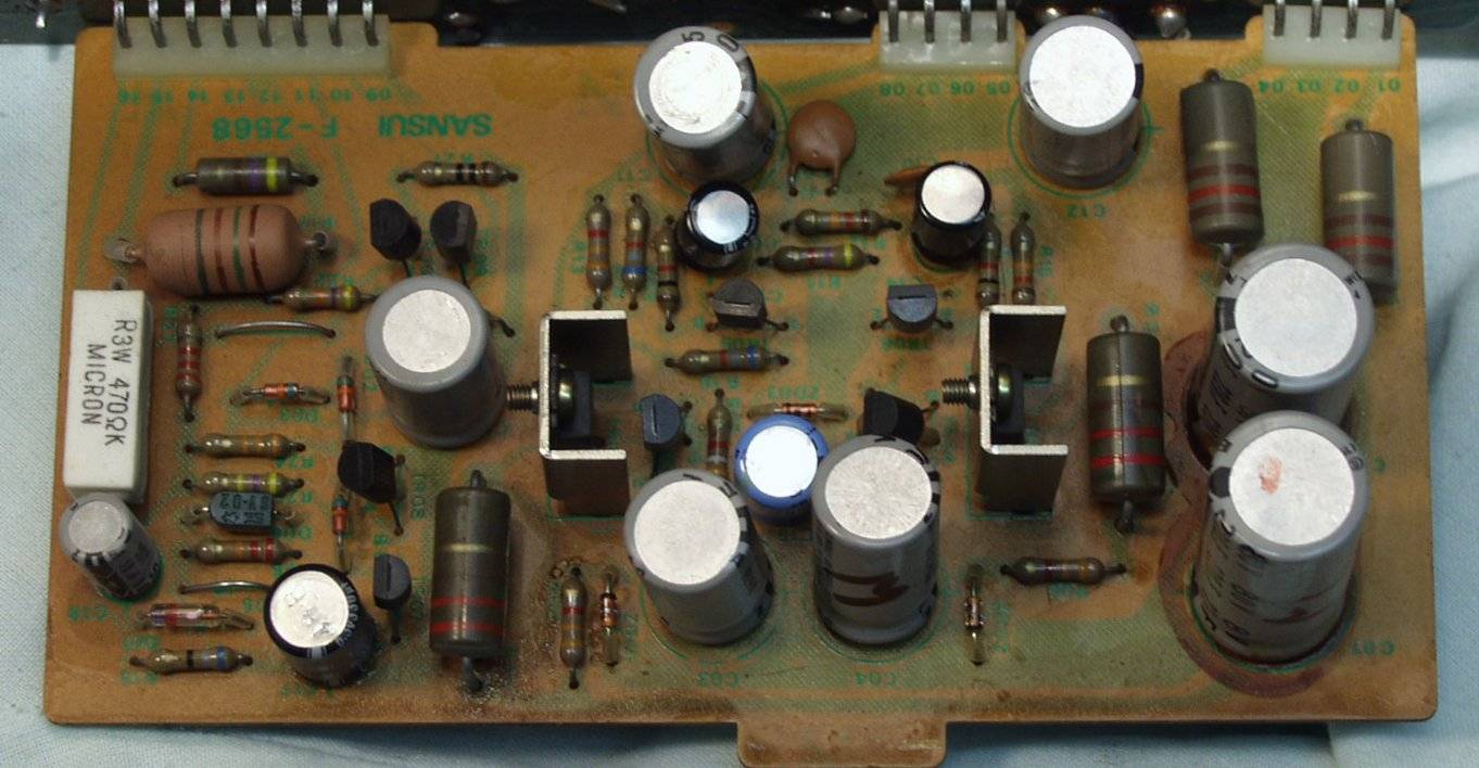 | C2B. 修理後 ドライバー基盤 初段TR(トランジスター)4個 半固定VR4個 電解コンデンサー8個交換 結合コンデンサーをメタライズドフイルムコンデンサーに交換=上の茶色の2個+裏に2個 |