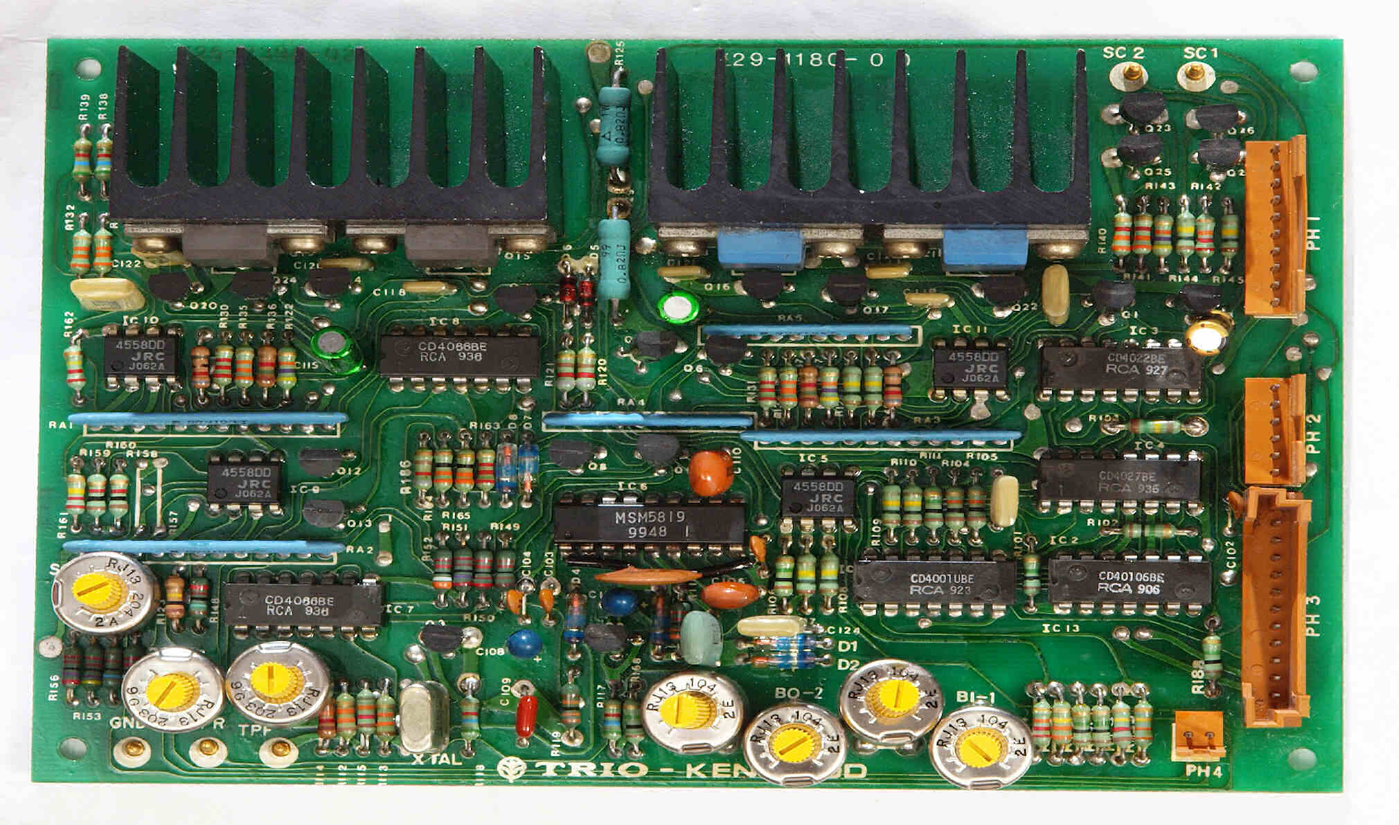 | C22. 修理後 制御基板 PLL_IC1個、OP−AMP4個、半固定VR7個、電解コンデンサー5個、フイルムコンデンサー1個交換 |