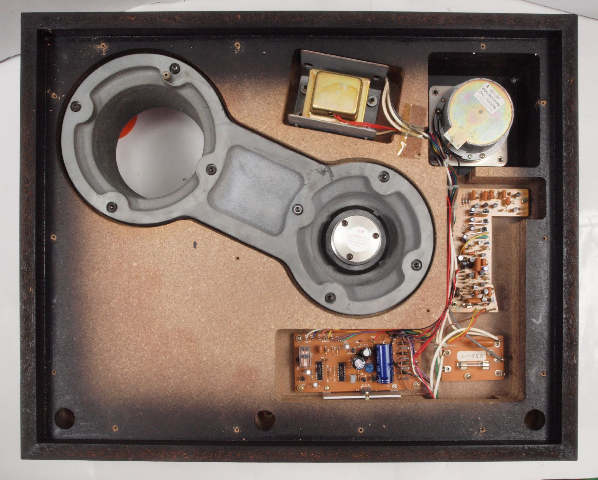 | W. 下蓋及び本体木部 修理状況。 画像をクリックすると、大きく(横幅2050ドット)表示されます。 W1. 修理前 モーター、基板、アーム架台を取り本体上から。 |