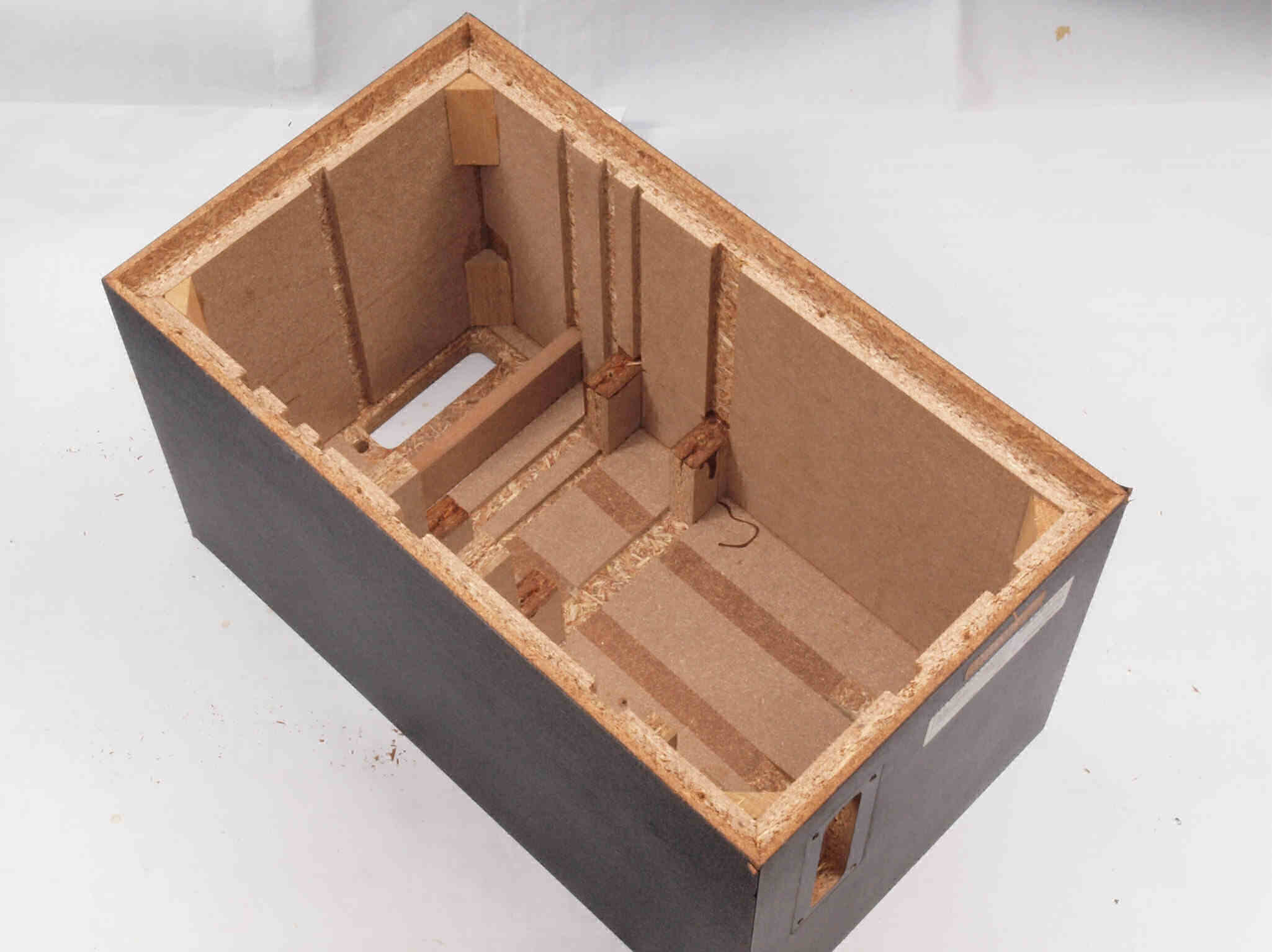 | C48. 修理中 接着材が劣化した木箱、下後左から見る。圧縮板にボンドを塗って固めている。 | ||||||||||||