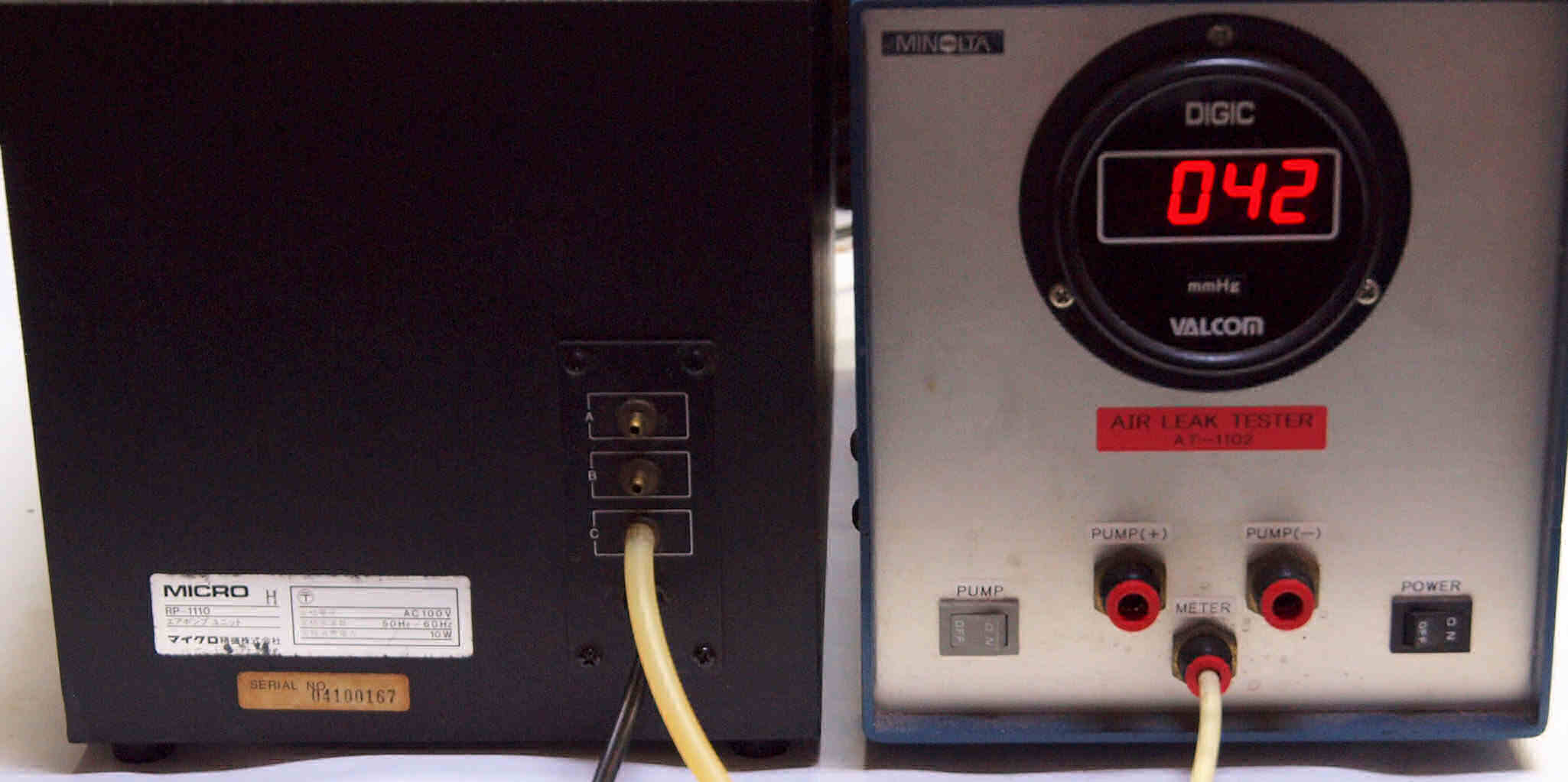 | S. 修理前点検・測定.。 画像をクリックすると、大きく(横幅2050ドット)表示されます。 S1. 測定中 「A=吐き出し用ポンプ」の圧力測定。 低い、120〜140位欲しい。 |