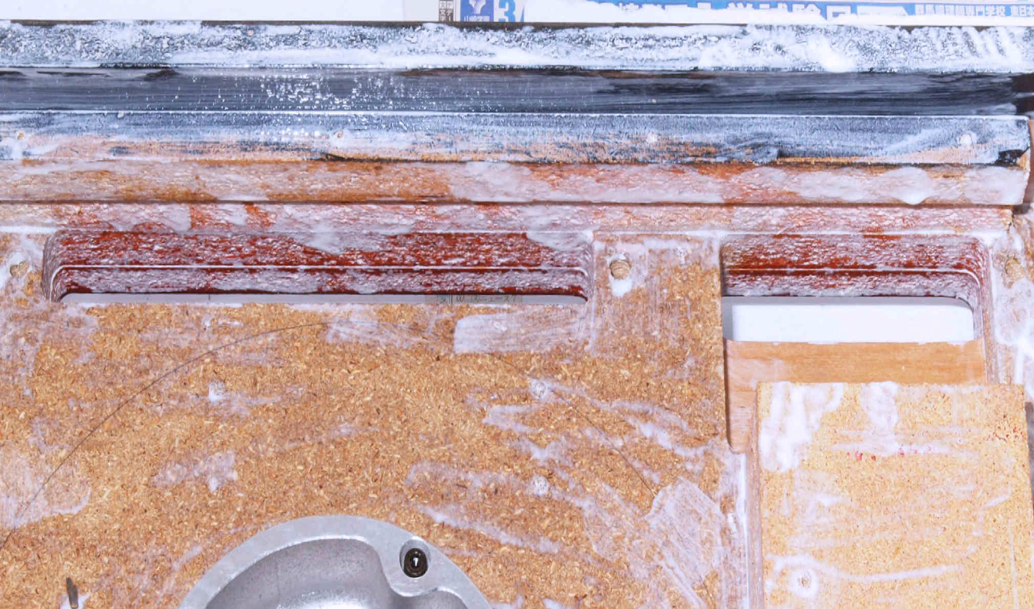| W6B. 修理中 底板裏側、 左から。 圧縮材に、水性木工ボンドを塗布する。 | ||||||||||||||||||||