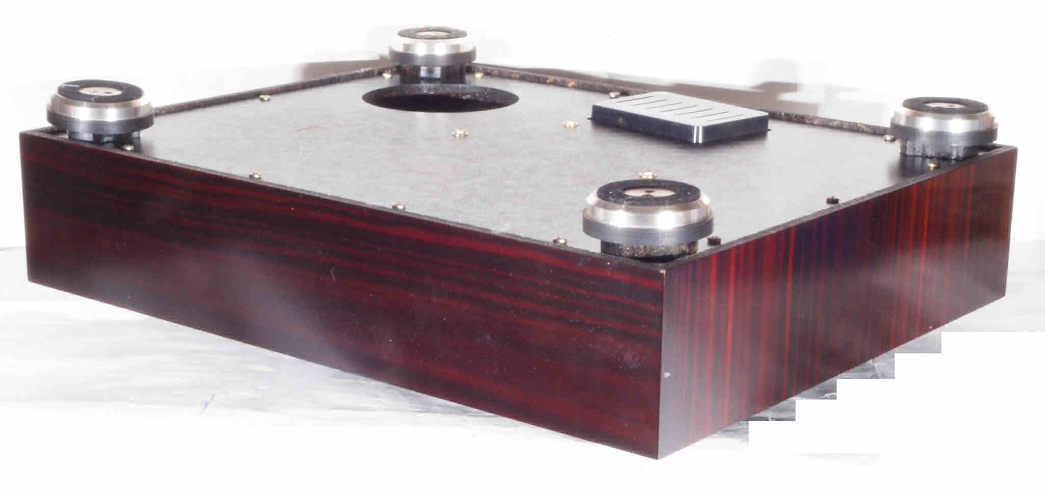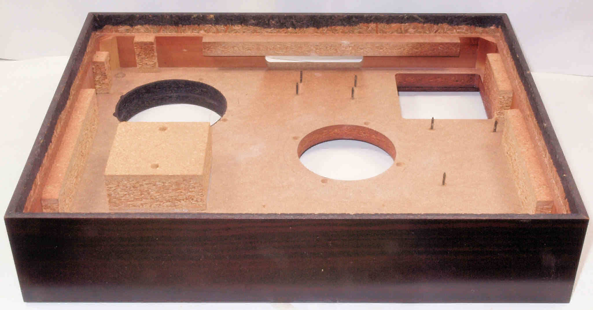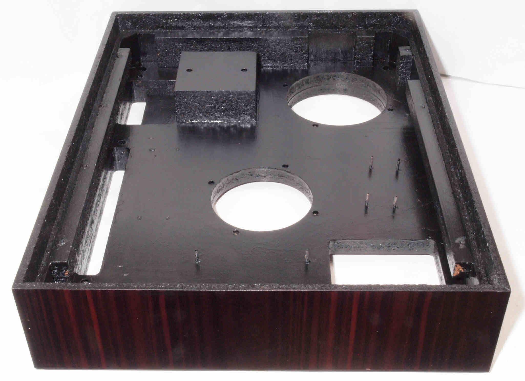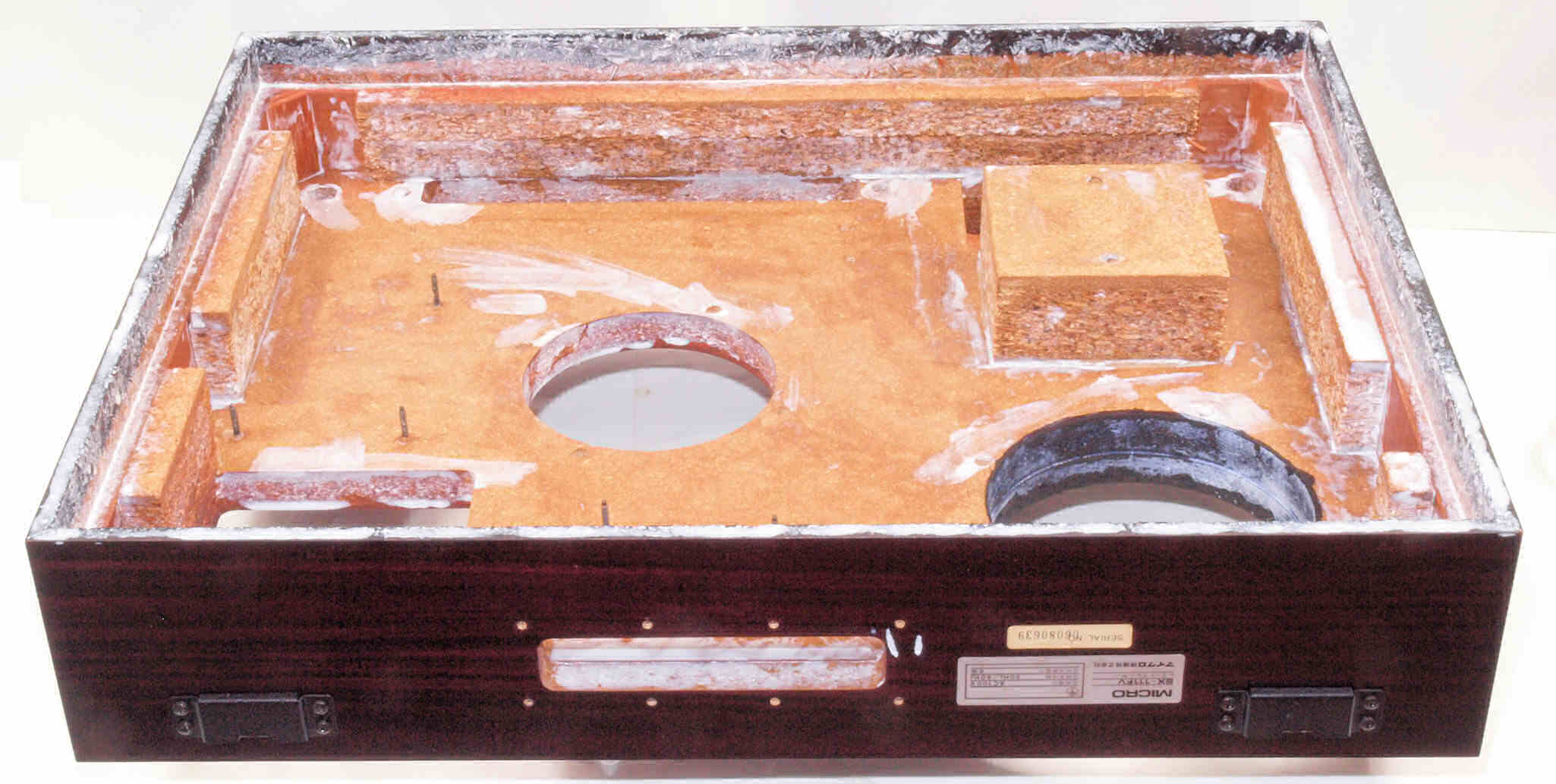 | W. 下蓋及び本体木部 修理状況。 画像をクリックすると、大きく(横幅2050ドット)表示されます。 W0. 修理前 タンテーブル軸ユニット、アーム取付一体シャーシを外した本体。 |