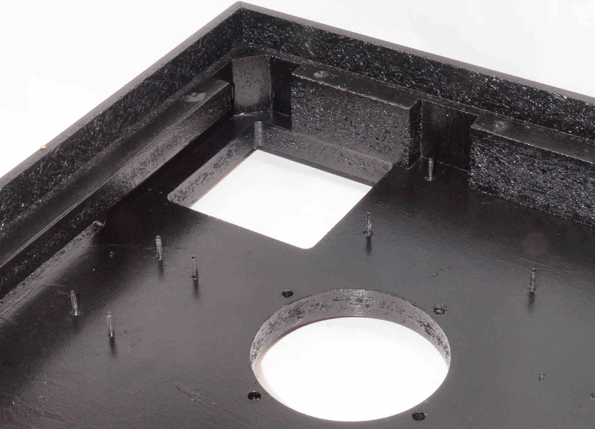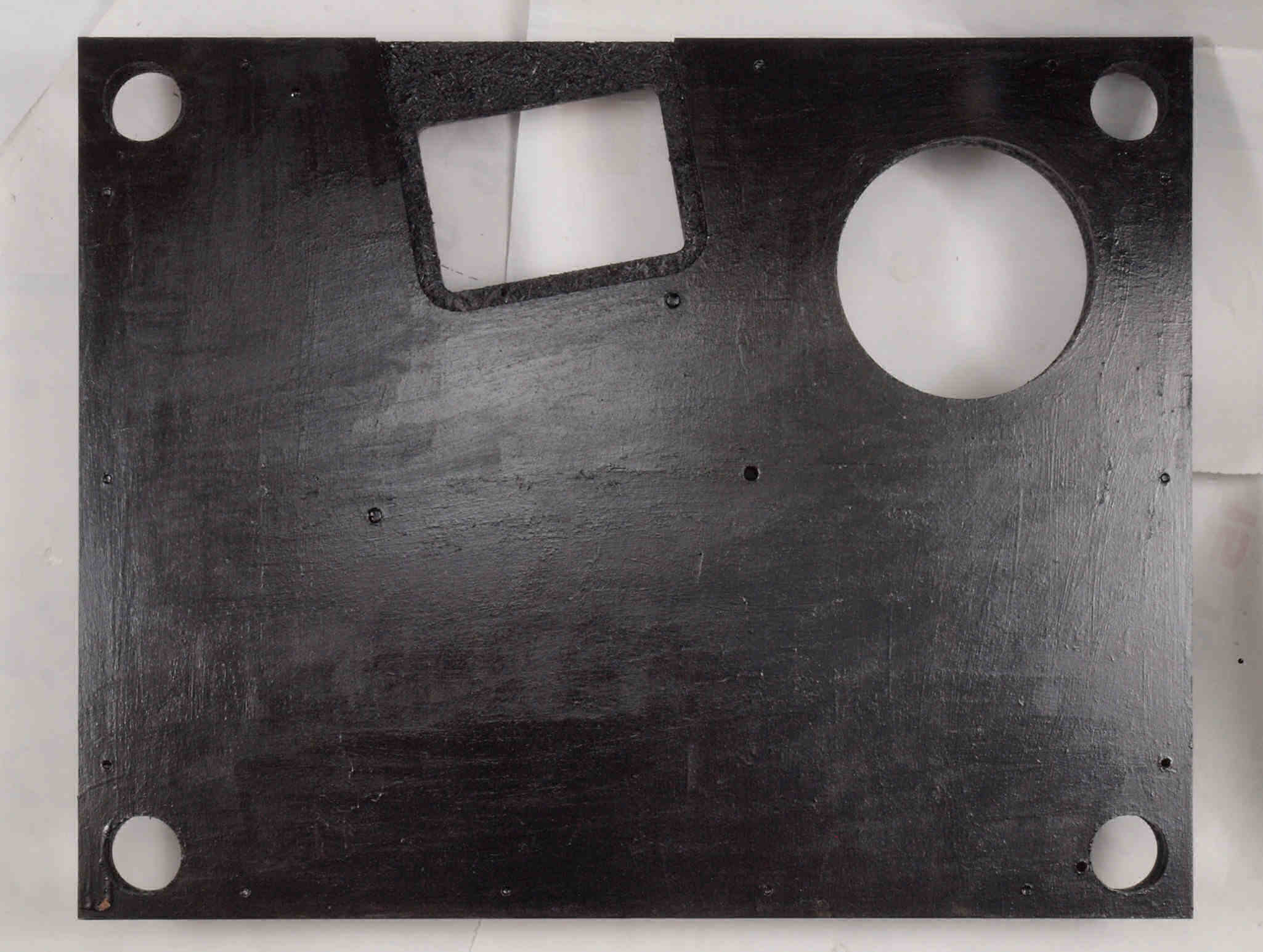 | W96. 修理中 底板裏側、アーム取り付け穴、反対側。さらに、キズを消す為と割れを防ぐのに、ペンキを塗る。 | ||||||||||||||||||||