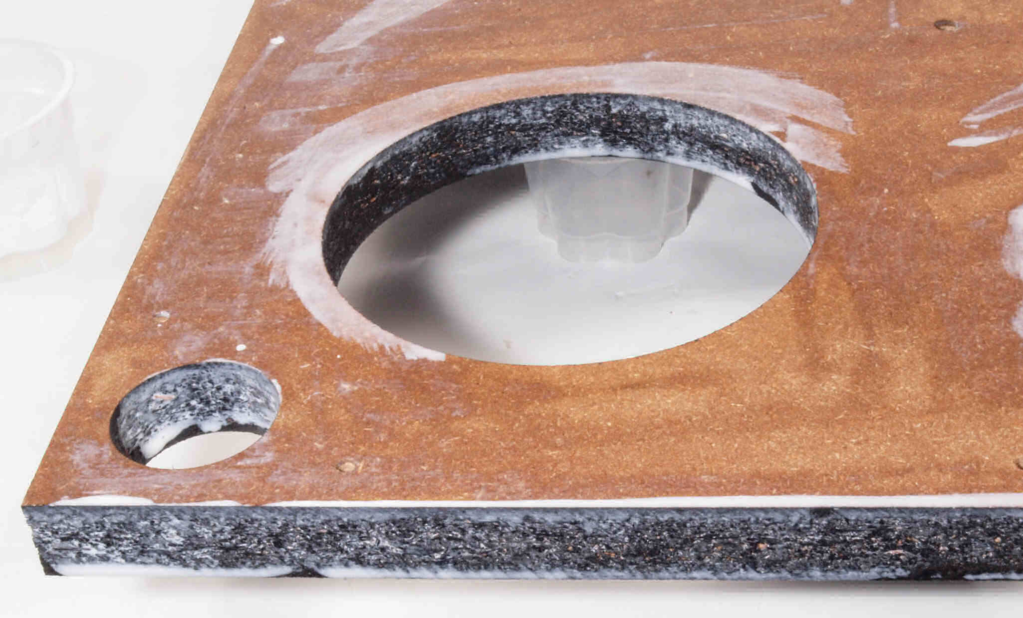 | W95. 修理中 底板裏側、アーム取り付け穴、反対側。水性木工ボンドを塗布する。 | ||||||||||||||||||||