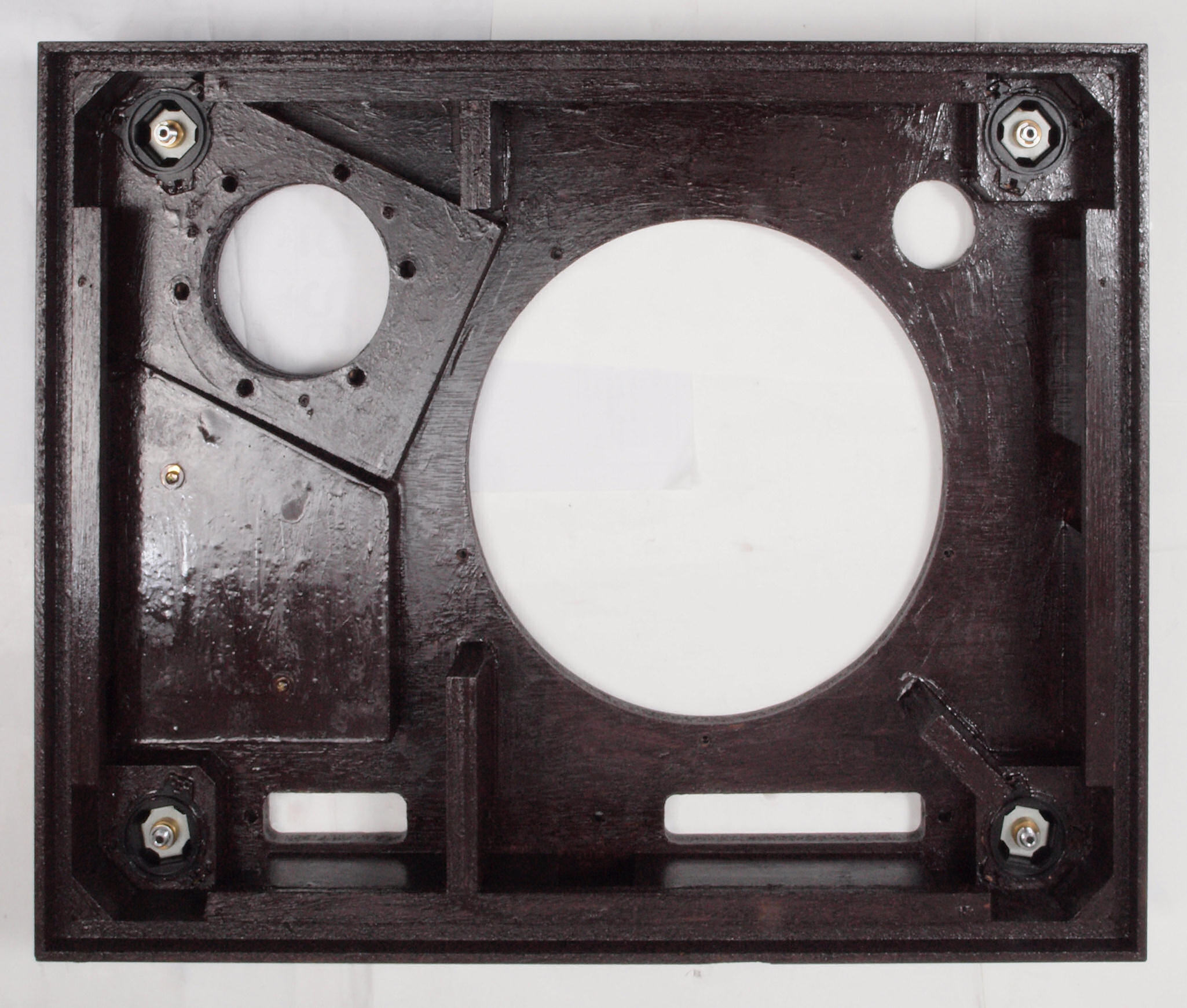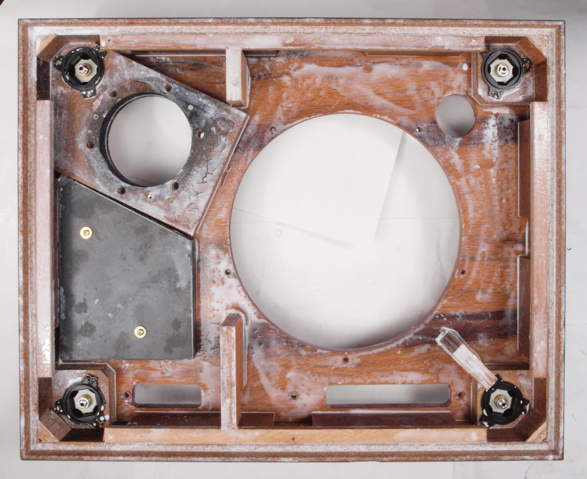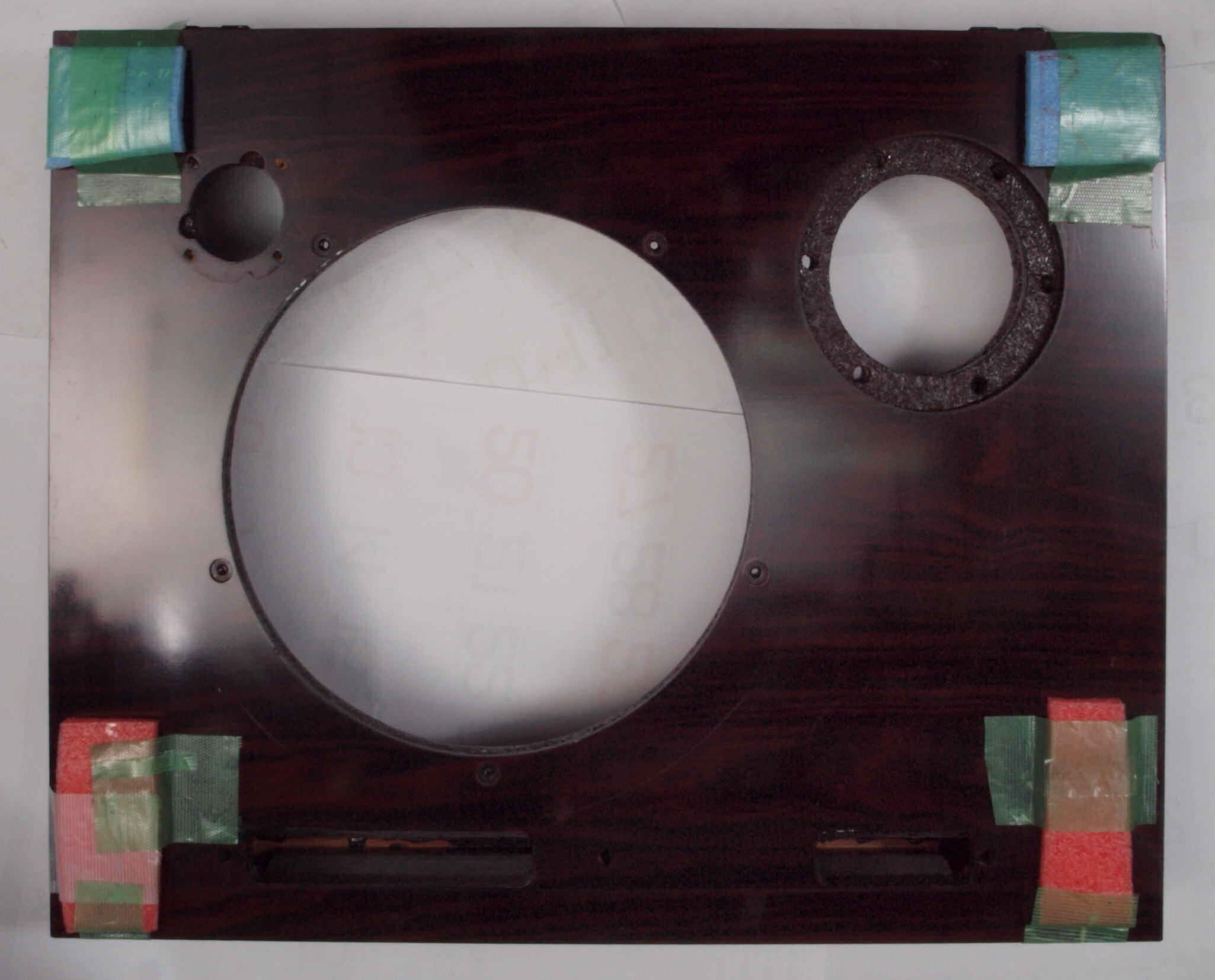 | W32. 修理中 本体木枠下。 圧縮材にボンドを染みこませる、ネジ穴も塗る。 | ||||||||||||||||||||||||||||||||||