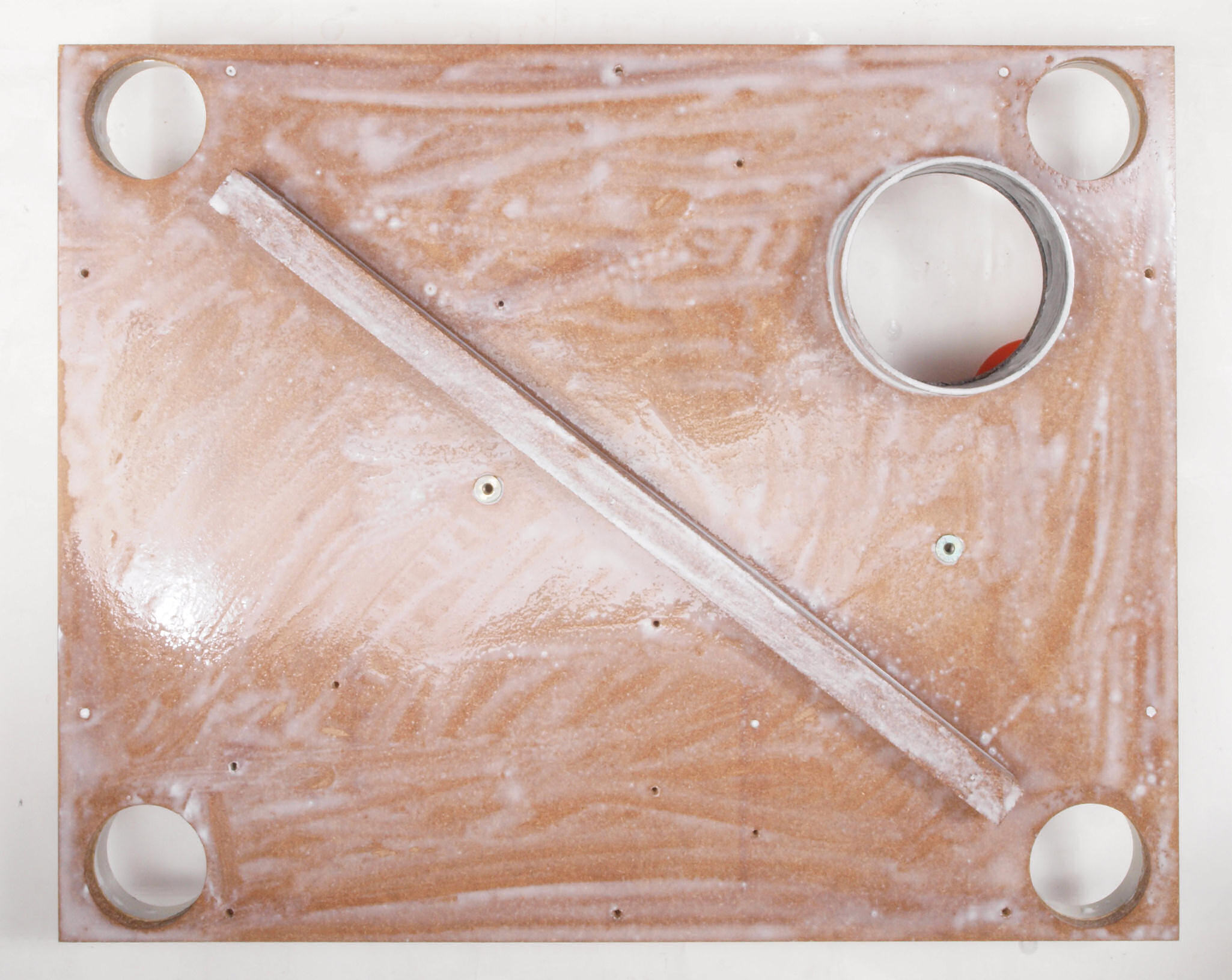 | W. 下蓋及び本体木部 修理状況。 画像をクリックすると、大きく(横幅2050ドット)表示されます。 W11. 修理後 本体上から。 圧縮材にボンドを染みこませる、更にペンキを塗る。 |